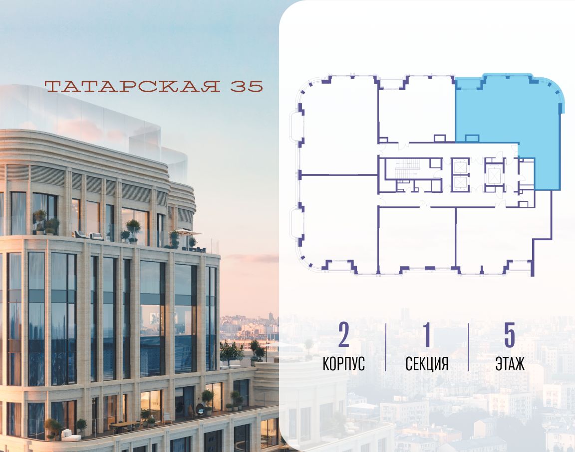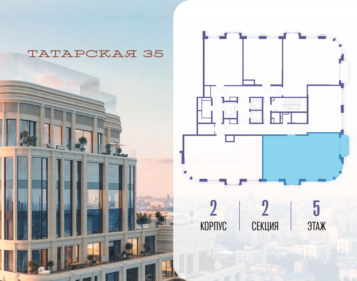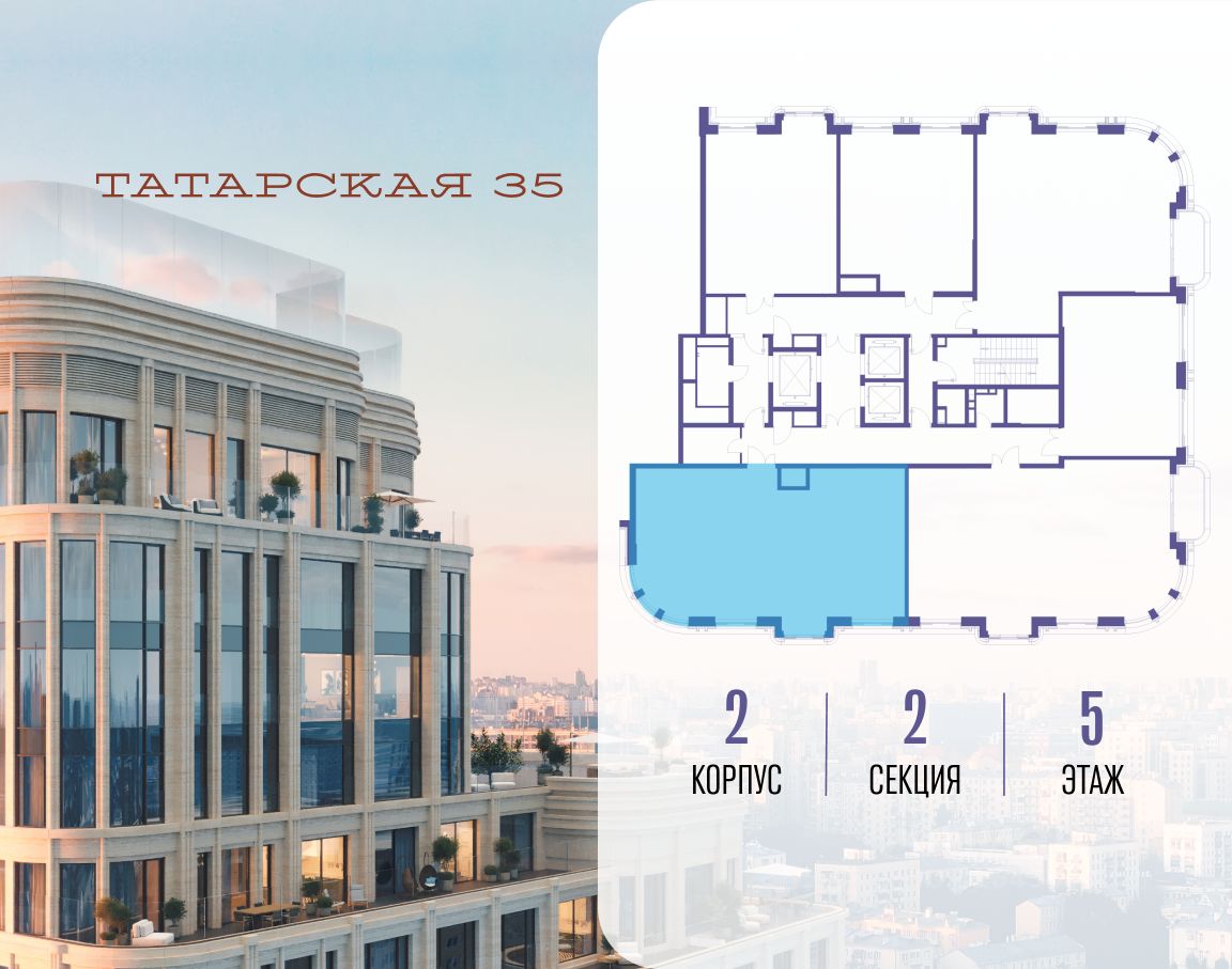 Продается просторная квартира площадью 111.60 м2 в жилом комплексе ТАТАРСКАЯ, 35. Квартира находится в 2 секции корпуса 2. Этаж 5-й из 19. Квартира без чистовой отделки, с просторной кухней 26.30 м2. Жилая площадь 47.50 м2. Высота потолка от 3.50. ТАТАРСКАЯ, 35 - новая архитектурная доминанта Замоскворечья, достопримечательность на фотопанорамах исторического центра Москвы. Элитный дом, созданный для тех, кто умеет смотреть далеко вперед, мыслить масштабно и воплощать собственный сценарий жизни. Вдохновляющие прогулки по променаду набережной, в уютных переулках, в парке ''Зарядье'', в Михайловском саду и Репинском сквере. Наслаждение высоким искусством в Третьяковской галерее, Доме Музыки, театральном музее им. А.А. Бахрушина, театре на Малой Ордынке. За окнами - Кремль, высотка на Котельнической, панорамы Замоскворечья и острова Балчуг, огни Садового кольца. Собственные спорт-румы, детская, репетиторская, бьюти-пространства, деловое пространство с коворкингом, переговорной и сигарной. Собственный трехуровневый фитнесс-центр с бассейном, тренажерным залом, сауной, хаммамом, массажным кабинетом. Площадь двора - 1,8 га, половина территории покрыта деревьями, кустарниками и лужайками. Дом расположен внутри Садового кольца - отсюда в считанные минуты можно добраться до важнейших мест столицы: достопримечательностей и парков, театров и ресторанов, деловых и административных центров. 7 минут до Кремля на автомобиле, 15 минут до Третьяковской галереи и 8 минут до Садового кольца пешком. Планировочные решения и визуализации предварительны, возможны изменения.