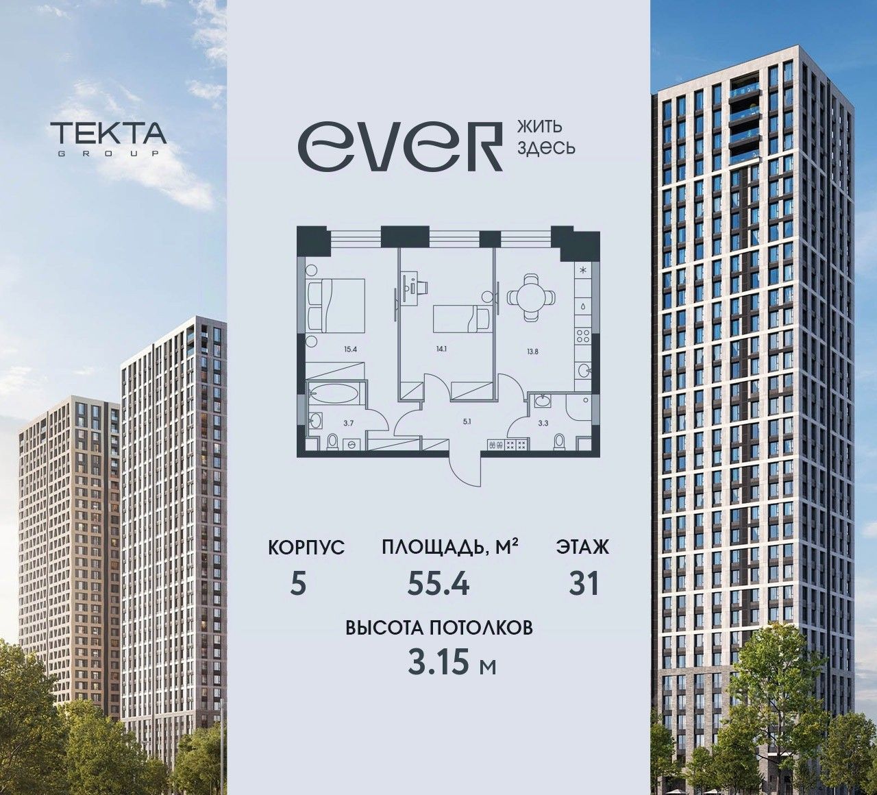 55 м² · Этаж 31 из 34