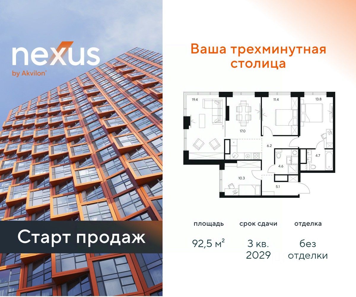 Продажа от застройщика. О проекте: В основе NEXUS by Akvilon лежит принцип трехминутного города, где вся жизнь: работа, отдых, здоровье, общение и культура сосредоточены в шаговой доступности. Он не просто экономит время, а кардинально перераспределяет его. В этих условиях главным логистическим узлом становится лифт, который в считанные секунды переносит из квартиры в собственный фитнес-рум, панорамный двор или современный коворкинг. Здесь вы сами решаете: оказаться в эпицентре событий, чувствуя пульс мегаполиса, или наслаждаться тишиной и приватностью своего пространства. И главное — вы можете переключаться, находя идеальный баланс каждый день. NEXUS by Akvilon - ваша трехминутная столица! Транспортная доступность NEXUS дарит независимость от расстояний и логистики. Ваше время теперь принадлежит только вам меньше минуты до метро Молодежная 2 минуты до Рублевского шоссе 10 минут до Проспекта Багратиона 15 минут до Москва-Сити 10 минут до МКАД 20 минут до ТТК Архитектура 46-этажная башня станет новой архитектурной доминантой, символизирующей динамику и технологичность современной жизни.Комбинация алюминиевых кассет, стеклофибробетона и витражного остекления фасада создает монументальную оболочку, а теплая цветовая гамма добавляет масштабной форме визуальной теплоты. Три разных по характеру стороны башни — от строгой ''зубчатой'' геометрии до живописных эркеров — создают многогранный, ритмичный образ, дополняемый невесомыми балконами со стеклянным ограждением. Архитектура проекта живет в диалоге с городом: променад вдоль парящего стилобата со стрит-ретейлом становится естественным продолжением общественного пространства. Планировки в концепции Разумные метры Мы создали квартиры, где пространство работает на ваш комфорт. В основе концепции ''Разумные метры'' правильная геометрия помещений и тщательно продуманные эргономичные решения. - Высота потолков до 3,55 метров - Многообразие планировок: от студий до четырехкомнатных квартир классического и евро-формата - Многофункциональные пространства: кухни-гостиные для приема гостей и зонированные мастер-спальни - Продуманная инфраструктура быта: отдельные постирочные и гостевые санузлы - Удобные системы хранения: встроенные ниши и гардеробные зоны - Уникальные форматы: пентхаусы, комнаты с двумя окнами, угловое панорамное остекление - Возможность открытия окон на всех высотах Для студий и однокомнатных квартир мы предлагаем готовое решение — отделку White box, позволяющую сразу приступить к чистовому ремонту на ваш вкус. Для остальных планировок предусмотрена черновая отделка, чтобы воплотить все интерьерные пожелания. Здесь пространство адаптируется под ваш образ жизни, а не вы подстраиваетесь под планировку. Приватное благоустройство Скрытый на виду панорамный двор-терраса, расположенный на высоте 7 метров, объединил внутреннюю камерность и внешнюю динамику городской жизни. - Многоуровневое озеленение с всесезонными композициями, сохраняющими декоративно