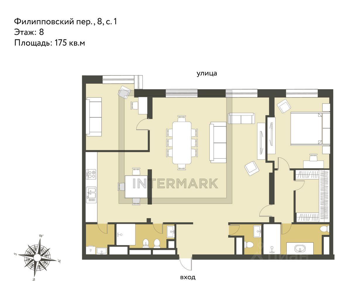 В продаже многокомнатная квартира квартира в элитном квартале ''Тишинский бульвар''. Общая площадь квартиры - 176.10 кв.м. Этаж 2 из 11. Корпус Ивовый 5. ''Тишинский бульвар'' - тихий зелёный элитный квартал на Тишинке, в престижном и комфортном районе центра Москвы. В нём создан уникальный для элитного дома прогулочный бульвар в своём огромном парке 1,9 га. В парке оборудованы зоны для активного и тихого отдыха, крытые галереи, приватные зелёные комнаты, многофункциональная спортивная площадка, воркаут-зона, детская площадка, сухой фонтан, ручей. В пешей доступности Римско-католический кафедральный собор. Всего в полутора километрах от квартала находятся Патриаршие пруды - излюбленное место для летних прогулок, воскресных бранчей и романтических ужинов. Белая площадь расположена ещё ближе - на расстоянии 1,2 километра. Это точка концентрации деловой жизни и модных ресторанов. В ''Тишинский бульваре'' только для жителей и их гостей создан уникальный для элитного дома прогулочный бульвар в собственном огромном парке площадью 2,1 га, который занимает 70% территории квартала. Бульвар проходит через весь квартал и объединяет в общее пространство три двора: Кленовый, Рябиновый и Ивовый. В парке созданы крытые галереи и приватные зелёные комнаты для отдыха и медитаций в любую погоду. Насыщенное озеленение многолетними растениями с разными периодами цветения сохраняет территорию квартала красивой круглый год. В квартале насыщенная инфраструктура только для жителей, включая Clubhouse. Здесь оборудованы пространства для здорового образа жизни по стандарту FIT LAB: в парке - многофункциональная спортивная площадка, воркаут-зона, место для занятий йогой и медитации, бесплатный фитнес-клуб с бассейном. Для маленьких жителей доступны детская площадка и игровая комната по стандарту KIDS LAB. Дома оснащены самыми полными и лучшими системами.
