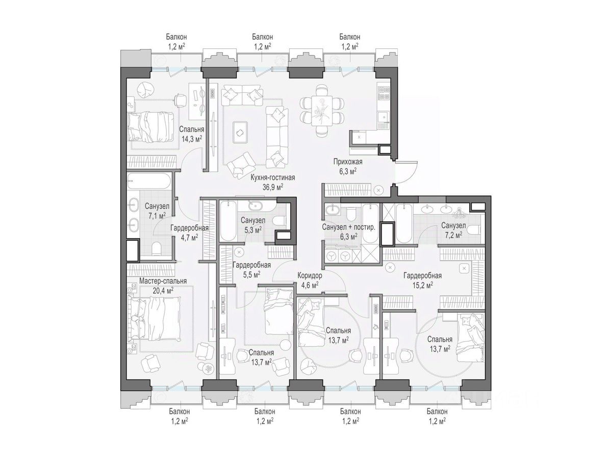 Комфортная и продуманная до мелочей 4-спальная квартира площадью 136.70 кв. м на 12 этаже в клубном доме 14. Увеличенная площадь окон и высота потолков 3.20 м дарят впечатляющие виды на парки, зеленые зоны и природные заказники. West Garden - это собрание клубных домов высотой 12-14 этажей в собственном парке 16 гектаров вдоль реки. Просторный среднеэтажный квартал расположен на Минской улице, в респектабельном Западном округе столицы. Вокруг премиальное окружение и более 1000 гектаров парков. West Garden - это возможность обеспечить себе и своей семье лучшие условия для жизни в одном из самых привлекательных и зелёных районов столицы. Гармония природы дополнена здесь впечатляющими возможностями и привилегиями: • Расположение в зелёном Западном районе столицы вблизи центра и ключевых магистралей в окружении парковых зон (заказник ''Долина реки Сетунь'', Мосфильмовский пруд, Ботанический сад МГУ, природный заказник ''Воробьёвы Горы'', Парк Победы на Поклонной горе) • Современная лаконичная архитектура, у каждого дома свой индивидуальный облик и выразительный фасад с использованием натуральных и долговечных материалов (гранит, известняк, клинкерный кирпич) • Функциональные лобби с отделкой из дерева и натурального камня с высокими потолками до 7,8 м • Самый большой собственный парк для прогулок и отдыха: 8 га собственной закрытой и благоустроенной территории, а также 8 га прилегающего парка на набережной с зонами отдыха с шезлонгами, маршрутами для бега, пеших и велосипедных прогулок • Инфраструктурный центр Clubhouse только для жителей: клубная гостиная с террасой и творческой атмосферой по фирменному стандарту Friend's Lab, детская игровая зона 300 кв. м по стандарту Kid's Lab • Насыщенная и разнообразная инфраструктура для детей любого возраста: 8 развивающих детских площадок в парке, 3 детские площадки на благоустроенной набережной, площадка для отдыха и досуга подростков • Спортивная инфраструктура по стандарту Fit Lab: многофункциональные площадки для футбола, баскетбола, волейбола с трибуной для болельщиков, зона воркаута, теннисные столы, зона для йоги, беговая дорожка 3 километра, фитнес-центр только для жителей • Комфортный и просторный подземный паркинг на 1313 машино-мест, 482 келлера, автомойка только для жителей на четыре поста