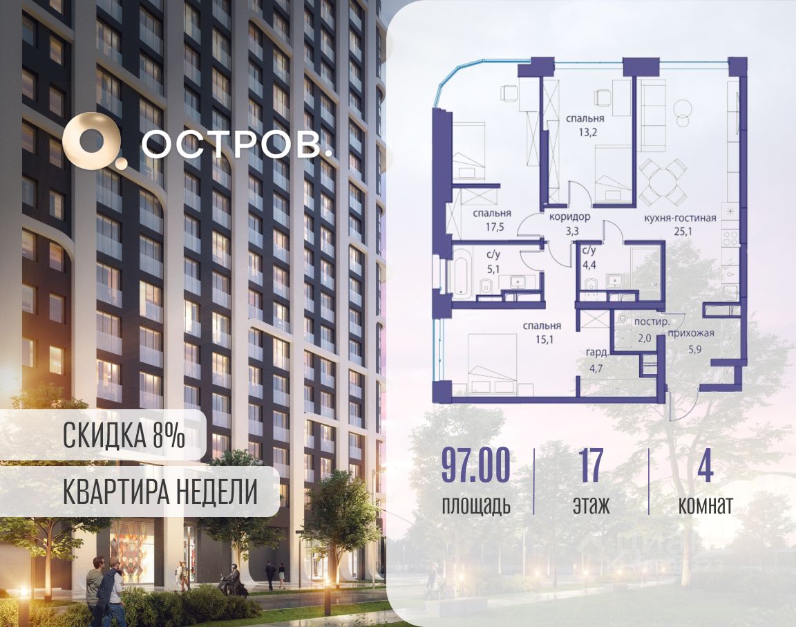 Акция квартира недели действует до 15.10.2025 на определённый пул квартир при 100% оплате и ипотеке без субсидированных программ. Подробности в офисе продаж. Продаётся 4-комн. квартира от застройщика: общая площадь 97.00 м², жилая 45.80 м², кухня 25.10 м², 17-й этаж, жилой квартал ''Остров 2'', корпус 5 (секция 1). Срок сдачи: 4 квартал 2024 года. 2 совмещенных санузла. В жилой зоне 2 больших окна на одну сторону, хорошая инсоляция. Позвоните сейчас и забронируйте квартиру! ОСТРОВ от Донстрой - жилой комплекс на западе Москвы, в Мневниковской пойме. Уникальное преимущество комплекса - в том, что он обособлен от города рекой и природным парком (650 га). Благодаря природному окружению эта территория имеет лучший экологический рейтинг в столице. Кварталы ОСТРОВА объединены ландшафтным дизайном в единое пространство - с набережными и Центральным бульваром. На ОСТРОВЕ любые объекты, необходимые для полноценной жизни и отдыха, находятся на расстоянии 15-минутной прогулки. Торговый центр и супермаркеты, кафе и рестораны, фитнес, салоны красоты, школы и детские сады. А также крупнейший в Москве спортивный кластер.