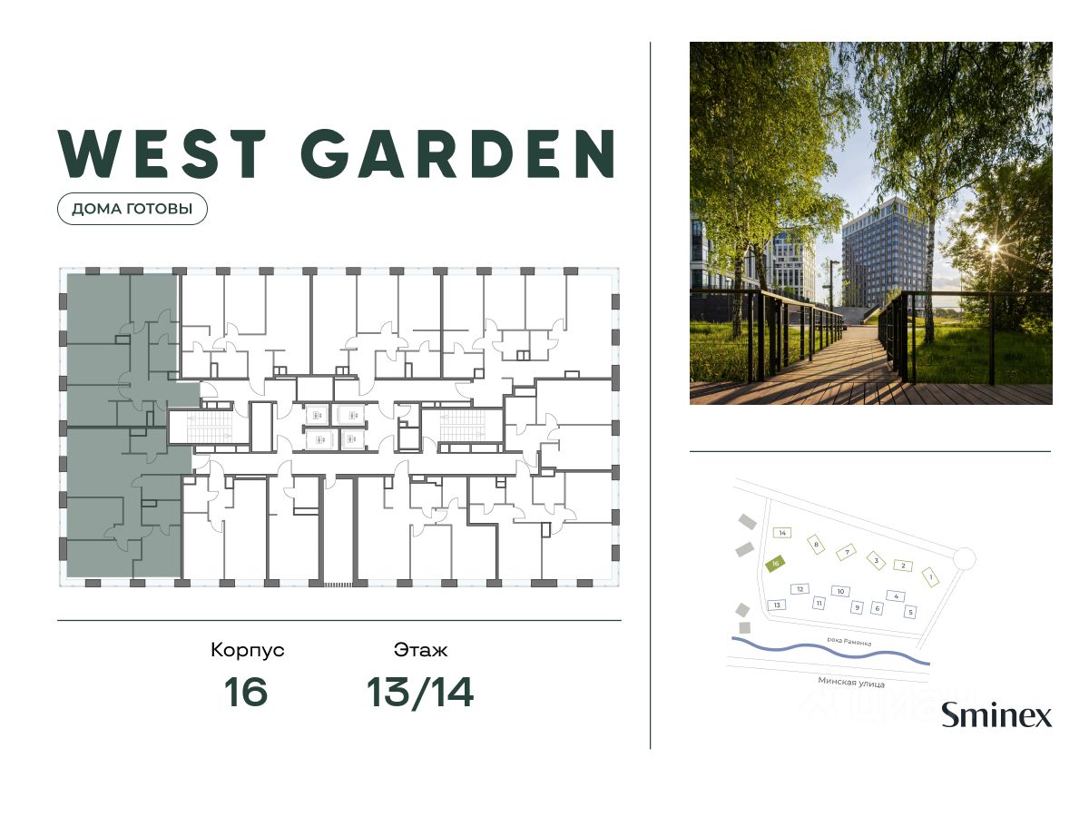Комфортная и продуманная до мелочей 3-спальная квартира площадью 92.10 кв. м на 13 этаже в клубном доме 16. Увеличенная площадь окон и высота потолков 3.23 м дарят впечатляющие виды на парки, зеленые зоны и природные заказники. West Garden - это собрание клубных домов высотой 12-14 этажей в собственном парке 16 гектаров вдоль реки. Просторный среднеэтажный квартал расположен на Минской улице, в респектабельном Западном округе столицы. Вокруг премиальное окружение и более 1000 гектаров парков. West Garden - это возможность обеспечить себе и своей семье лучшие условия для жизни в одном из самых привлекательных и зелёных районов столицы. Гармония природы дополнена здесь впечатляющими возможностями и привилегиями: • Расположение в зелёном Западном районе столицы вблизи центра и ключевых магистралей в окружении парковых зон (заказник ''Долина реки Сетунь'', Мосфильмовский пруд, Ботанический сад МГУ, природный заказник ''Воробьёвы Горы'', Парк Победы на Поклонной горе) • Современная лаконичная архитектура, у каждого дома свой индивидуальный облик и выразительный фасад с использованием натуральных и долговечных материалов (гранит, известняк, клинкерный кирпич) • Функциональные лобби с отделкой из дерева и натурального камня с высокими потолками до 7,8 м • Самый большой собственный парк для прогулок и отдыха: 8 га собственной закрытой и благоустроенной территории, а также 8 га прилегающего парка на набережной с зонами отдыха с шезлонгами, маршрутами для бега, пеших и велосипедных прогулок • Инфраструктурный центр Clubhouse только для жителей: клубная гостиная с террасой и творческой атмосферой по фирменному стандарту Friend's Lab, детская игровая зона 300 кв. м по стандарту Kid's Lab • Насыщенная и разнообразная инфраструктура для детей любого возраста: 8 развивающих детских площадок в парке, 3 детские площадки на благоустроенной набережной, площадка для отдыха и досуга подростков • Спортивная инфраструктура по стандарту Fit Lab: многофункциональные площадки для футбола, баскетбола, волейбола с трибуной для болельщиков, зона воркаута, теннисные столы, зона для йоги, беговая дорожка 3 километра, фитнес-центр только для жителей • Комфортный и просторный подземный паркинг на 1313 машино-мест, 482 келлера, автомойка только для жителей на четыре поста