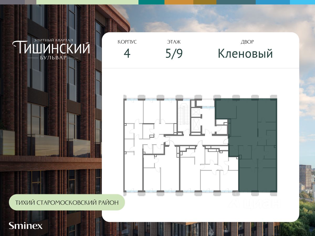 В продаже 4-комнатная квартира квартира в элитном квартале ''Тишинский бульвар''. Общая площадь квартиры - 152.90 кв.м. Этаж 5 из 9. Корпус Кленовый 4. ''Тишинский бульвар'' - тихий зелёный элитный квартал на Тишинке, в престижном и комфортном районе центра Москвы. В нём создан уникальный для элитного дома прогулочный бульвар в своём огромном парке 1,9 га. В парке оборудованы зоны для активного и тихого отдыха, крытые галереи, приватные зелёные комнаты, многофункциональная спортивная площадка, воркаут-зона, детская площадка, сухой фонтан, ручей. В пешей доступности Римско-католический кафедральный собор. Всего в полутора километрах от квартала находятся Патриаршие пруды - излюбленное место для летних прогулок, воскресных бранчей и романтических ужинов. Белая площадь расположена ещё ближе - на расстоянии 1,2 километра. Это точка концентрации деловой жизни и модных ресторанов. В ''Тишинский бульваре'' только для жителей и их гостей создан уникальный для элитного дома прогулочный бульвар в собственном огромном парке площадью 2,1 га, который занимает 70% территории квартала. Бульвар проходит через весь квартал и объединяет в общее пространство три двора: Кленовый, Рябиновый и Ивовый. В парке созданы крытые галереи и приватные зелёные комнаты для отдыха и медитаций в любую погоду. Насыщенное озеленение многолетними растениями с разными периодами цветения сохраняет территорию квартала красивой круглый год. В квартале насыщенная инфраструктура только для жителей, включая Clubhouse. Здесь оборудованы пространства для здорового образа жизни по стандарту FIT LAB: в парке - многофункциональная спортивная площадка, воркаут-зона, место для занятий йогой и медитации, бесплатный фитнес-клуб с бассейном. Для маленьких жителей доступны детская площадка и игровая комната по стандарту KIDS LAB. Дома оснащены самыми полными и лучшими системами.
