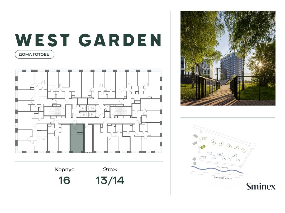 Комфортная и продуманная до мелочей квартира-студия площадью 27.00 кв. м на 13 этаже в клубном доме 16. Увеличенная площадь окон и высота потолков 3.23 м дарят впечатляющие виды на парки, зеленые зоны и природные заказники. West Garden - это собрание клубных домов высотой 12-14 этажей в собственном парке 16 гектаров вдоль реки. Просторный среднеэтажный квартал расположен на Минской улице, в респектабельном Западном округе столицы. Вокруг премиальное окружение и более 1000 гектаров парков. West Garden - это возможность обеспечить себе и своей семье лучшие условия для жизни в одном из самых привлекательных и зелёных районов столицы. Гармония природы дополнена здесь впечатляющими возможностями и привилегиями: • Расположение в зелёном Западном районе столицы вблизи центра и ключевых магистралей в окружении парковых зон (заказник ''Долина реки Сетунь'', Мосфильмовский пруд, Ботанический сад МГУ, природный заказник ''Воробьёвы Горы'', Парк Победы на Поклонной горе) • Современная лаконичная архитектура, у каждого дома свой индивидуальный облик и выразительный фасад с использованием натуральных и долговечных материалов (гранит, известняк, клинкерный кирпич) • Функциональные лобби с отделкой из дерева и натурального камня с высокими потолками до 7,8 м • Самый большой собственный парк для прогулок и отдыха: 8 га собственной закрытой и благоустроенной территории, а также 8 га прилегающего парка на набережной с зонами отдыха с шезлонгами, маршрутами для бега, пеших и велосипедных прогулок • Инфраструктурный центр Clubhouse только для жителей: клубная гостиная с террасой и творческой атмосферой по фирменному стандарту Friend's Lab, детская игровая зона 300 кв. м по стандарту Kid's Lab • Насыщенная и разнообразная инфраструктура для детей любого возраста: 8 развивающих детских площадок в парке, 3 детские площадки на благоустроенной набережной, площадка для отдыха и досуга подростков • Спортивная инфраструктура по стандарту Fit Lab: многофункциональные площадки для футбола, баскетбола, волейбола с трибуной для болельщиков, зона воркаута, теннисные столы, зона для йоги, беговая дорожка 3 километра, фитнес-центр только для жителей • Комфортный и просторный подземный паркинг на 1313 машино-мест, 482 келлера, автомойка только для жителей на четыре поста
