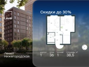 Цена указана с учётом скидки при 100%-й оплате, несубсидированной ипотеке, рассрочке (кроме программы ''Рассрочка 0%''). В активно развивающемся районе на юго-востоке столицы продается 1-комнатная квартира площадью 38,5 кв.м без отделки.. Квартира расположена на 36 этаже 45-этажного этажного корпуса 1 в жилом комплексе комфорт-класса Левел Нижегородская (компания Level Group/Левел групп). Отличная транспортная доступность- 10 мин. пешком до станции метро, МЦД-4, БКЛ и МЦК ''Нижегородская'',- 13 мин. пешком до станций метро ''Андроновка'' и ''Перово'',- 10 мин. на авто до ТТК,- 14 мин. на авто до Садового кольца. БлагоустройствоБлагоустроенная территория комплекса делится на внешнюю и внутреннюю. Внутренняя часть - это закрытый двор 0,9 га, где обустраиваются детские площадки для разных возрастных групп, беседки для отдыха и работы, несколько спортивных зон, включая воркаут-зоны и лужайку для бадминтона. Здесь же появится ухоженный луг с прогулочными маршрутами.Рядом с жилым комплексом будет создан ландшафтный парк площадью 2,4 га. В парке будут высажены высокие деревья, луговые травы и кустарники, благоустроены лаунж-зоны у пруда, дорожки для бега и прогулок. В центре парка предусмотрена событийная площадь, рядом расположатся дополнительные спортивные и детские площадки, а также зона для выгула домашних питомцев. Внутренняя инфраструктураДома жилого комплекса будут оснащены коммерческими помещениями, где откроются все необходимые сервисы: магазины, аптеки, салоны красоты, кофейни, службы доставки и многое другое. Комфорт - это когда всё рядом.Кроме того, на территории Левел Нижегородская предусмотрен подземный отапливаемый паркинг. Этап 1 включает 335 машино-мест и 143 кладовых помещения для хранения сезонных вещей. Технологии и безопасностьНа территории всех общественных зон постоянно ведется видеонаблюдение и предусмотрен высокоскоростной Wi-Fi. Подъезды, паркинг и внутренний двор оснащены системой контроля доступа. Для удобства жителей создано мобильное приложение, позволяющее связаться с управляющей компанией, осуществлять удаленное управление видеодомофоном или просмотреть изображение отдельных видеокамер по заявке.Для безопасного перемещения по этажам и комфортного спуска в паркинг будут установлены современные лифты от компании BLT Brilliant Elevator. Скорость лифтов - 1,6 - 2,5 м/с. Особенности- Архитектура от экспертов из бюро ARCH(E)TYPE,- Разноуровневая застройка - от секций средней этажности до высоток в 45 этажей (этап 1),- Окна шириной до 2,2 метров (этап1) с видами на Останкинскую башню, Измайловский парк, ''Москва-Сити'' и Кусковский лесопарк,- Лобби с окнами в пол и потолками от 3,4 метров, оснащенные консьерж-сервисом,- Более 35 видов планировок, включая редкие форматы.Артикул 1-414.