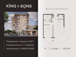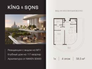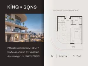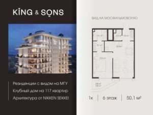 KING & SONS это клубный дом на 117 резиденций премиум-класса, расположенный на престижной и исторической улице Мосфильмовская. Из большинства квартир открываются панорамные виды на МГУ, ''Москву-Сити'', особняки посольств и парки. Это место для тех, кто не хочет выбирать между комфортом мегаполиса и уединением на природе.Проект разработан японским архитектурным бюро NIKKEN. Фасады из натурального камня, мягкие формы здания, максимально открытое остекление, окна в пол — все это делает облик здания выразительным и уникальным.В проекте предусмотрено 70% квартир с террасами. Потолки от 3,2 до 4,7 м. Паркинг на 110 машиномест.Для будущих резидентов продуманы разнообразные общественные пространства зимний сад в лобби первого этажа, секретный сад с зоной открытого огня, лаундж-зона с кинотеатром на крыше, собственный спортзал, зоны для занятий йогой и медитацией.KING & SONS это фамильная недвижимость, которую с гордостью передают по наследству, как искусство и бриллианты.