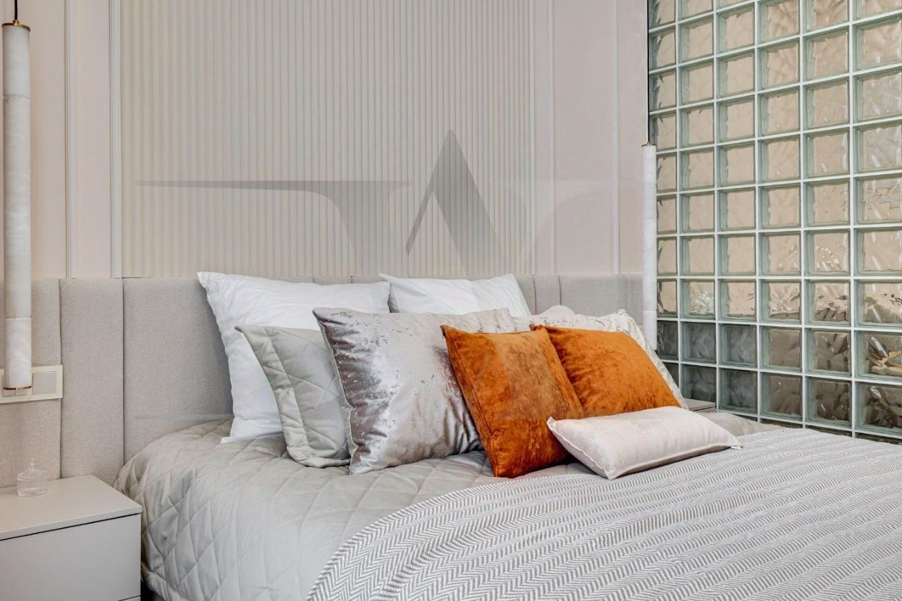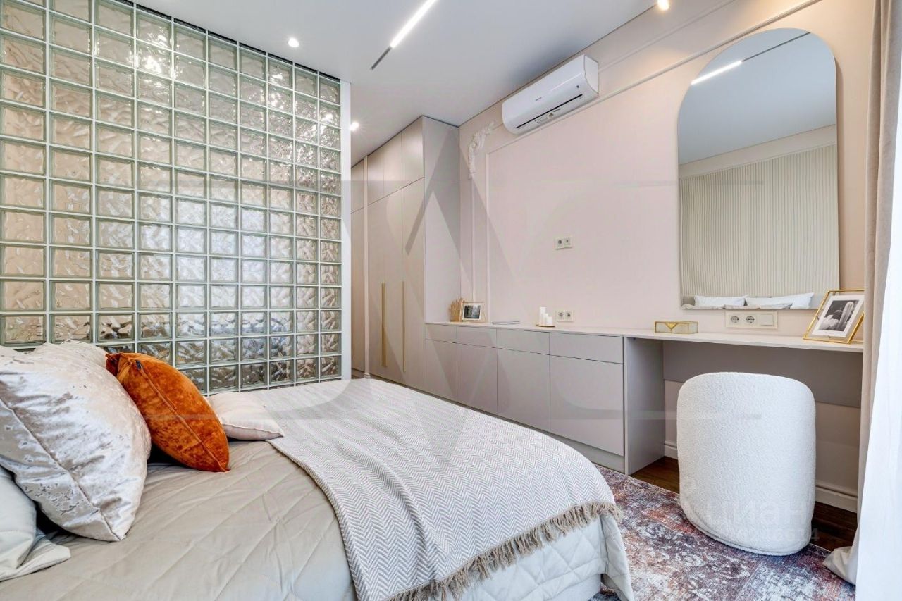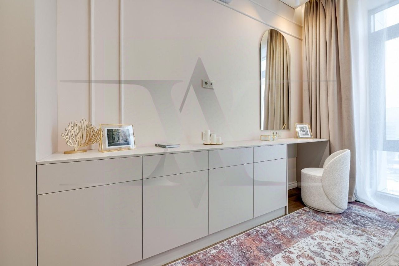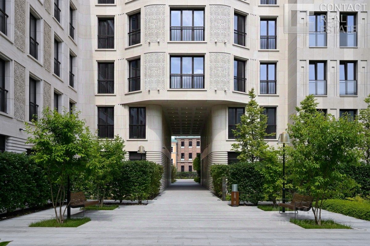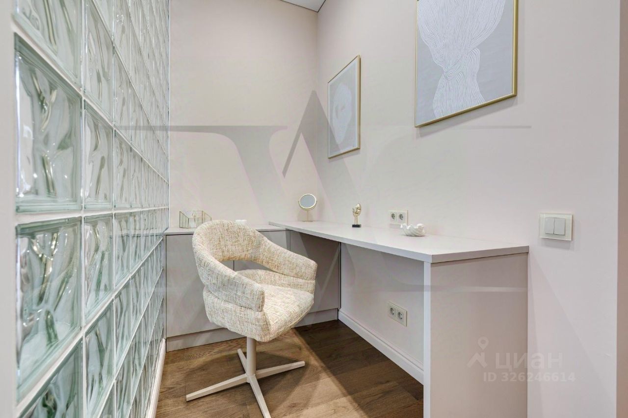 Делюкс в Хамовниках - самая выгодная цена за исключительное качество . Описание квартиры: На фоне сдержанной бело-песочной палитры изумрудный диван спинкой чертит мягкую дугу и собирает вокруг себя разговоры и взгляды. Терракотовые барные стулья у острова — тёплые акценты закатного песка, на них приятно задержаться с бокалом, наблюдая, как хрустальные подвесы рассыпают свет, будто крупную морскую соль. Кухня — вежливый шёпот Дубая: филигранные радиусы, латунные линии, гладкий камень. В нише с мягко закруглёнными углами прячется техника, а рельеф острова и тёплый орех задают тактильный ритм. Дубовый паркет, уложенный английской ёлочкой, неслышно ведёт из зоны кулинарных ритуалов в гостиную — туда, где на стенах классические пилястры держат тонкую грань между традицией и новизной. Мастер-спальня дышит бежевыми туманами. Кровать будто парит над полом, геометрия гарнитура вписана в единую линию, а латунный светильник расставляет точки над и. Настенная панель с тонкими световыми швами ведёт взгляд, не повышая голос. Элегантное трюмо выслушает все ваши секретики. Ванная — прохлада камня и штрих малахита: рифлёная тумба глубокого зелёного оттенка, двойные зеркала с мягкой подсветкой и тёплая латунь сантехники. Рисунок плитки мерно повторяет тему округлостей тактично следуя общей тональности интерьеров. Квартира, в которой форма становится манерой говорить, а каждый день — поводом остаться подольше. Здесь книги читаются глубже, а паузы между словами становятся вкуснее. Главное о квартире: третий этаж, 100 квадратных метров, мастер-блок, вторая спальня, гостевой санузел. Высота потолков три метра. Виды из окон в направлении променада . Квартира оборудована брендовой мебелью последних коллекций от итальянских производителей, и техникой премиального сегмента . Предусмотрена приточно-вытяжная система вентиляции с климат-контролем ,фильтрация воды до уровня питьевой. Элементы умного дома: электропривод штор, множество сценариев освещения. Новый премиальный ремонт, первичная продажа - никто не жил. Эксклюзивно в Whitewill