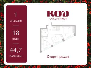 Продаются 1-к апартаменты площадью 44.7 кв.м. на 9-м этаже 33 этажного дома в ЖК ''Мираполис'' от ГК ОСНОВА.МИРАПОЛИС - проект для тех, кому важно, чтобы под рукой было всё для работы, отдыха и жизни. Проект состоит из четырех башен с авторскими стеклянными фасадами и lounge-rooftop под открытым небом. С высоты птичьего полета резиденты будут наслаждаться видами на город и расположенные рядом парки: ''Лосиный остров'', ''Сокольники'', ''Ботанический сад'', ''Сад будущего'' и ''ВДНХ''.МИРАПОЛИС расположен в 3 минутах пешком от МЦК ''Ростокино''. За 5 минут - можно добраться до ст.м. ВДНХ на машине, а быстрый выезд на главные транспортные магистрали (ТТК и Проспект мира) позволит доехать на личном авто до центра Москвы за полчаса.В просторных лобби с дизайнерской отделкой продуман круглосуточный консьерж-сервис, приватные зоны с мягкой мебелью и комнаты для мытья лап питомцам. Панорамные окна и потолки высотой 3,1 м, а система ''умный дом'' значительно упростит жизнь резидентам и автоматизирует бытовые процессы. Концептуальный проект предлагает все преимущества бизнес-класса: подземный паркинг, торговый центр и супермаркет, фитнес-клуб, бассейн и SPA, офисы и коворкинги - всё для полноценной и комфортной жизни в столице.