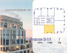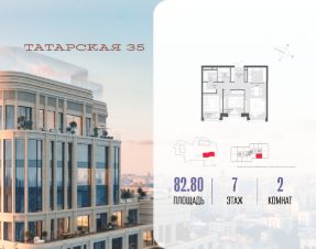 Продается просторная квартира площадью 82.80 м2 в жилом комплексе ТАТАРСКАЯ, 35. Квартира находится в 1 секции корпуса 3. Этаж 7-й из 24.Квартира без чистовой отделки, с просторной кухней 28.90 м2. Жилая площадь 29.50 м2. Высота потолка от 3.50.ТАТАРСКАЯ, 35 - новая архитектурная доминанта Замоскворечья, достопримечательность на фотопанорамах исторического центра Москвы. Элитный дом, созданный для тех, кто умеет смотреть далеко вперед, мыслить масштабно и воплощать собственный сценарий жизни.Вдохновляющие прогулки по променаду набережной, в уютных переулках, в парке ''Зарядье'', в Михайловском саду и Репинском сквере. Наслаждение высоким искусством в Третьяковской галерее, Доме Музыки, театральном музее им. А.А. Бахрушина, театре на Малой Ордынке. За окнами - Кремль, высотка на Котельнической, панорамы Замоскворечья и острова Балчуг, огни Садового кольца.Собственные спорт-румы, детская, репетиторская, бьюти-пространства, деловое пространство с коворкингом, переговорной и сигарной. Собственный трехуровневый фитнесс-центр с бассейном, тренажерным залом, сауной, хаммамом, массажным кабинетом. Площадь двора - 1,8 га, половина территории покрыта деревьями, кустарниками и лужайками.Дом расположен внутри Садового кольца - отсюда в считанные минуты можно добраться до важнейших мест столицы: достопримечательностей и парков, театров и ресторанов, деловых и административных центров. 7 минут до Кремля на автомобиле, 15 минут до Третьяковской галереи и 8 минут до Садового кольца пешком.Планировочные решения и визуализации предварительны, возможны изменения.