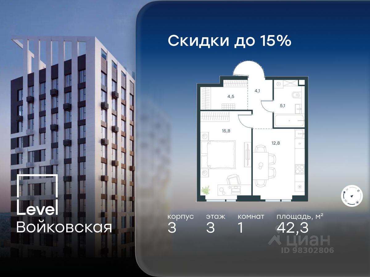 Цена указана с учётом скидки при 100%-й оплате, несубсидированной ипотеке, рассрочке (кроме программы ''Рассрочка 0%''). Продается 1-комнатная квартира площадью 42.30 кв. м без отделки. Квартира находится на 3 этаже 20-этажного корпуса 3, в новом жилом комплексе бизнес-класса Level Войковская, расположенном рядом с живописным заповедником ''Покровское-Стрешнево'' (застройщик - компания Level Group/Левел групп). Прекрасная транспортная доступность - 7 мин. пешком до станции МЦК ''Балтийская'', - 15 мин. пешком до станции метро ''Войковская'', - 8 мин. на машине до ТТК, - 15 мин. на машине до центра Москвы, - 20 мин. на машине до Москва-Сити. Продуманный архитектурный проект - стильная архитектура от мастерской Фефелова В. В., - панорамные виды на парки, Химкинское водохранилище и Останкинскую башню, - лобби с высотой потолков до 6,45 метров, - более 20 видов планировочных решений, включая редкие форматы квартир с террасой и увеличенной высотой потолков до 5,42 метров, - 2 варианта дизайнерской отделки в корпусе 4, предлагаются как дополнительная опция к отделке white box: стиль Modern в светлых холодных тонах и стиль Classic в нейтральной бежевой гамме. Квартиры в корпусах 3 и 5 сдаются без отделки. Расположение Level Войковская строится в престижном Северном округе Москвы. Развитая инфраструктура и живописная природа переплетаются в единый ансамбль, столь значимый для комфортной жизни. Войковский район окружают парки и набережные. В шаговой доступности - парк ''Покровское-Стрешнево'', не более 15-ти минут на велосипеде занимает путь до Тимирязевского парка и 9-ти минут до парка усадьбы Михалково. Рядом более 60 школ, 75 дошкольных учреждений, 17 государственных и 6 частных вузов, 25 супермаркетов, 4 торговых центра, среди которых ТЦ ''Метрополис'' и ТЦ ''Авиапарк''. Внутренняя инфраструктура На территории жилого комплекса предусмотрены коммерческие помещения: кафе, ресторан, пекарня и другие сервисы откроются на первых этажах корпусов. Для жителей будет доступен отапливаемый подземный паркинг на 244 машино-места с доступом с любого этажа на лифте. На территории паркинга будет расположено 125 кладовых помещений для хранения сезонного инвентаря. Лобби и благоустройство Дизайн лобби Level Войковская создан совместно с бюро BLANK. Это уютные гостиные, где хочется задержаться. Теплая цветовая гамма, ресепшен, зоны ожидания, лапомойки и гостевые санузлы - каждая деталь превращает лобби в комфортное продолжение вашего дома. 1,15 га площади в первых двух этапах строительства отведено под приватный внутренний двор, который спроектирован совместно с бюро ''Правда''. Детские площадки для всех возрастов, спортивные пространства для йоги, воркаута и петанка, уютные зоны для тихого отдыха или работы. Здесь утро начинается с вдохновения, а вечер наполнен приятными моментами. Лифты Комфортное перемещение внутри жилого комплекса будут обеспечивать надёжные лифты с доступом в паркинг с жилых этажей. В каждом корпусе предусмотрено по 3 грузопассажирских лифта.