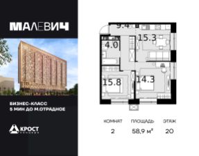 Продаётся 2-к квартира 58.9 кв.м. на 20-м этаже 28 этажного дома. Без отделки. Срок сдачи: 1 кв. 2026 г.Дом MALEVICH - это идеальный проект мультифункционального жилого дома, в котором все элементы общественных и личных пространств тщательно продуманы и спроектированы.Здание состоит из двух объемов, один из которых сдвинут относительного другого в горизонтальной плоскости.Авторы идеи придумали совмещать различные слои и цвета бетонов в одной плоскости и рисовать картины не кистью и красками, а различными рецептами бетонов. Картины украсят полы, стены и потолки входных групп, подземного паркинга, мест общего пользования.В Доме MALEVICH не один, а сразу 2 парковых общественных пространства, каждое из которых обладает собственной функцией: - внутренний двор только для жителей во внутренней части здания,- открытый парк-вернисаж на ул. Отрадная, доступный для внешних посетителей.Проект дома расширяет возможности вашей квартиры, предоставляя дополнительное пространство для работы, отдыха, учебы, дружеского общения и воспитания детей.Прямая продажа от застройщика ООО СЗ ''Аквапарк ''Отрадное ''.