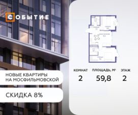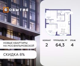 Около 10 минут до Москва Сити и ТТК! В продаже 2-к квартира от застройщика. Общая площадь 66.8, жилая 20.9, кухня 45.9. Квартира расположена на 2 этаже жилого квартала ''Событие-6'', корпус 2, Секция Секция 3. Квартира без отделки. Срок сдачи: 4 кв. 2029 года. СОБЫТИЕ.6 — финальный дом парк квартала СОБЫТИЕ на Мосфильмовской, созданный для тех, кто хочет ''заняться жизнью'' здесь и сейчас и получать максимум от каждого дня. Стильная архитектура, продуманное благоустройство и богатый набор общественных пространств делают дом естественной сценой для ярких личных событий. Архитектура от бюро Atrium на базе дизайн кода британских LDA Design и UHA London. Лучшая новостройка страны 2025 года! Расположение: • Около 710 минут пешком до станций метро ''Аминьевская'' и ''Мичуринский проспект'' (в зависимости от маршрута) • Около 15 минут до Садового кольца • Около 25 минут до аэропорта Внуково • Рядом — ключевые магистрали (Кутузовский, Мичуринский, Ломоносовский проспекты, Аминьевское шоссе), что упрощает выезды как в центр, так и за город Инфраструктура ''всё у дома'' Главный центр притяжения — модный парк ''Событие'' от бюро Wowhaus. Благоустроенный бульвар и рекреационные зоны занимают около половины территории квартала, а природная часть парка площадью более 12 гектаров уже открыта. В парке проложены: • примерно 1,5 км беговых дорожек • около 2,7 км велодорожек • около 1,6 км экотропы • детские и спортивные площадки, места для пикника, лекторий, декоративный огород, восстановленные биотопы • Парк ''Событие'' — финалист конкурса Правительства Москвы в номинации ''Строительство парков и общественных пространств'' Мультидвор Двор СОБЫТИЯ.6 — это мультимодальное пространство для жителей всех возрастов. Здесь предусмотрены: • игровые и развивающие площадки для малышей и детей постарше • воркаут зоны, площадки для игр с мячом и йоги для активных взрослых • мини бульвар с фонтаном для прогулок • террасы, амфитеатры и лаунжи для спокойного отдыха и встреч • Комьюнити террасы и общественные пространства на кровле 10 этажа Внутри дома предусмотрен полный набор общественных пространств: • детская игровая комната и детский клуб • спортрум / фитнес рум • коворкинг и комнаты для занятий с репетитором • дизайнерские лаунж зоны для деловых и личных встреч Район и окружение: парки, университеты, спорт Район относится к числу самых экологичных в Москве: он буквально утопает в зелени парков и заповедников. В окружении — парк ''Событие'', природный заказник ''Долина реки Раменки'', Воробьевы горы, Матвеевский лес, парк 50 летия Октября, парк Олимпийской деревни, Вороновский парк, набережные Москвы реки, заказник ''Долина реки Сетунь''. Это настоящая ''интеллектуальная миля'' Москвы: рядом МГУ имени М. В. Ломоносова, ботанический сад МГУ, театр им. Н. И. Сац, Новодевичий монастырь, стадион ''Лужники'', Парк Победы и другие знаковые объекты. Район особенно комфортен для сторонников ЗОЖ: множество мест для бега, велопрогулок, спорта на открытом воздухе и