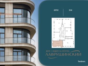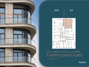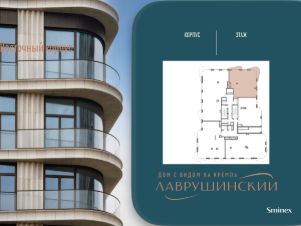 Просторная светлая квартира площадью 105.3 кв. м. Окна выходят в тихий приватный двор-парк с ландшафтным дизайном и Пыжёвский переулок. Панорамное остекление, моллированное окно и открытый балкон в кухне-гостиной (34.7 кв. м) улучшают видовые характеристики квартиры. Продуманная планировка позволяет разместить две спальные комнаты с отдельными санузлами и гардеробными. В ванной, примыкающей к мастер-спальне, предусмотрено окно, создающее атмосферу загородного дома.''Лаврушинский'' - бескомпромиссный дом с лучшими видами на Кремль. Благодаря расположению всего в одном километре от Кремля, своей высоте и малоэтажной окружающей застройке, из квартир открываются поразительные прямые виды на главные достопримечательности центра Москвы, включая храм Христа Спасителя и собор Василия Блаженного. Расположение в глубине квартала, посередине парка, дает удивительное для центра ощущение тишины и простора.На закрытой территории находится самый большой на элитном рынке собственный ландшафтный парк площадью 1,4 га с фонтаном, ручьём, зонами для воркаута и тихого отдыха. KIDS LAB: развивающая детская площадка на улице и игровая комната в помещении. FIT LAB: фитнес-клуб с 25-метровым бассейном, beauty room, доступные только для жителей.В проекте уникальный выбор квартир с просторными балконами, пентхаусов с террасами, бассейнами и каминами, максимальными видовыми характеристиками, а также роскошных вилл. Всего - 153 квартиры и 101 продуманное планировочное решение. Высота потолков составляет от 3,5 до 8,25 м. В доме предусмотрен 2х-уровневый паркинг на 279 машино-места.В доме предусмотрен полный комплекс систем комфорта, включающий приточно-вытяжную вентиляцию с тонкой фильтрацией с принципом забора воздуха с высоты 50 метров для повышения продолжительности жизни, отдельный сервисный лифт для обслуживающего персонала и другие современные системы.