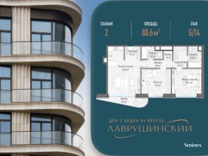 Просторная светлая квартира площадью 85.8 кв. м. Кухня-гостиная обращена окнами в сторону Марфо-Мариинской обители, а панорамное остекление улучшает видовые характеристики квартиры. Продуманная планировка позволяет разместить две приватные спальные комнаты с отдельными гардеробными и санузлами.''Лаврушинский'' - бескомпромиссный дом с лучшими видами на Кремль. Благодаря расположению всего в одном километре от Кремля, своей высоте и малоэтажной окружающей застройке, из квартир открываются поразительные прямые виды на главные достопримечательности центра Москвы, включая храм Христа Спасителя и собор Василия Блаженного. Расположение в глубине квартала, посередине парка, дает удивительное для центра ощущение тишины и простора.На закрытой территории находится самый большой на элитном рынке собственный ландшафтный парк площадью 1,4 га с фонтаном, ручьём, зонами для воркаута и тихого отдыха. KIDS LAB: развивающая детская площадка на улице и игровая комната в помещении. FIT LAB: фитнес-клуб с 25-метровым бассейном, beauty room, доступные только для жителей.В проекте уникальный выбор квартир с просторными балконами, пентхаусов с террасами, бассейнами и каминами, максимальными видовыми характеристиками, а также роскошных вилл. Всего - 153 квартиры и 101 продуманное планировочное решение. Высота потолков составляет от 3,5 до 8,25 м. В доме предусмотрен 2х-уровневый паркинг на 279 машино-места.В доме предусмотрен полный комплекс систем комфорта, включающий приточно-вытяжную вентиляцию с тонкой фильтрацией с принципом забора воздуха с высоты 50 метров для повышения продолжительности жизни, отдельный сервисный лифт для обслуживающего персонала и другие современные системы.
