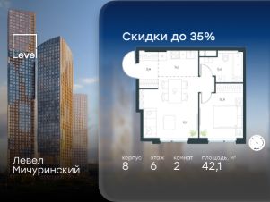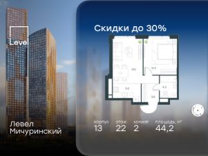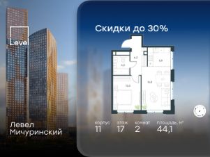 Цена указана с учётом скидки при 100%-й оплате, несубсидированной ипотеке, рассрочке (кроме программы ''Рассрочка 0%''). В жилом квартале, расположенном на границе с природным заказником ''Долина реки Очаковки'', продаётся 2-комнатная квартира площадью 43.20 кв.м без отделки. Квартира расположена на 15 этаже 24-этажного корпуса 11 в жилом комплексе бизнес-класса Левел Мичуринский (компания Level Group/Левел групп). Отличная транспортная доступность: - от 10 мин. пешком до станции метро ''Мичуринский проспект''- 15 мин. пешком до станции метро ''Аминьевская''- 7 мин. на авто до МКАД- 10 мин. на авто до ТТК- 15 мин. на авто до Москва-Сити Продуманный архитектурный проект:- Выразительная архитектура от известных бюро: корпуса 1-6 - СПИЧ, корпуса 7-13 - Borisov Architects,- Из окон открываются живописные виды на парки, Москва-Сити и МГУ,- Высокие потолки до 6,35 м,- Стильные лобби с окнами в пол и высокими потолками до 4,7 м,- С каждого этажа дома на лифте можно спуститься в подземный отапливаемый паркинг.Расположение:Жилой комплекс Левел Мичуринский строится в одном из самых зелёных районов Москвы - Очаково-Матвеевское. Этот уголок столицы идеален для поддержания здорового образа жизни. В шаговой доступности от проекта находятся заказник ''Долина реки Очаковки'' - 1 мин. пешком и Очаковский парк - 7 мин. пешком. На велосипеде можно добраться до таких парков, как ''Событие'', парк Олимпийской деревни, парк 50-летия Октября и парк Школьников.В 15 минутах езды на авто расположено более 30 детских садов (из них 14 в пешей доступности), 32 школы (из них 13 в пешей доступности) и 14 вузов. Также в ближайшем окружении - более 25 медицинских учреждений, 11 спортивных клубов и 22 продуктовых супермаркета.Внутренняя инфраструктура:На территории жилого комплекса строится три детских сада и школа. На первых этажах домов откроется супермаркет, фитнес-центр, ресторан, кафе и другие сервисы. Подземные этажи займут паркинги: трёхуровневые - в этапах 1 и 2, одноуровневый - в этапах 3 и 4.Преимущества проекта:- 4,5 га благоустроенной территории с видовым мостом, уличным кинотеатром, зонами для тихого отдыха, работы, воркаута, площадки для петанка, футбола, настольного тенниса и пляжного волейбола.- Дизайнерские лобби с панорамным видом на двор, мойками для лап животных и комфортными зонами ожидания.- Безопасность жителей: круглосуточное видеонаблюдение всех зон общего пользования (лобби, лифты, паркинги, детские площадки), система контроля доступа, управление видеодомофоном через мобильное приложение, единый ключ доступа на территорию жилого комплекса.- Технологии и комфорт: высокоскоростной Wi-Fi в лобби и на придомовой территории, автоматическая система контроля и учёта ресурсов, абонентская связь с консьержем, распознавание номеров автомобилей при въезде в паркинг и выезде из него.