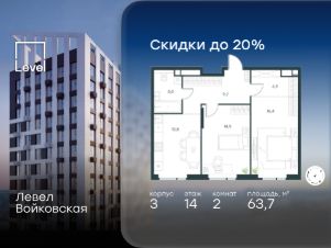 Цена указана с учётом скидки при 100%-й оплате, несубсидированной ипотеке, рассрочке (кроме программы ''Рассрочка 0%'').Продается 2-комнатная квартира площадью 63.70 кв. м без отделки. Квартира находится на 14 этаже 20-этажного корпуса 3, в новом жилом комплексе бизнес-класса Левел Войковская, расположенном рядом с живописным заповедником ''Покровское-Стрешнево'' (застройщик - компания Level Group/Левел групп).Прекрасная транспортная доступность- 7 мин. пешком до станции МЦК ''Балтийская'',- 15 мин. пешком до станции метро ''Войковская'',- 8 мин. на машине до ТТК,- 15 мин. на машине до центра Москвы,- 20 мин. на машине до Москва-Сити. Продуманный архитектурный проект- стильная архитектура от мастерской Фефелова В. В.,- панорамные виды на парки, Химкинское водохранилище и Останкинскую башню,- лобби с высотой потолков до 6,45 метров,- более 20 видов планировочных решений, включая редкие форматы квартир с террасой и увеличенной высотой потолков до 5,42 метров,- 2 варианта дизайнерской отделки в корпусе 4, предлагаются как дополнительная опция к отделке white box: стиль Modern в светлых холодных тонах и стиль Classic в нейтральной бежевой гамме. Квартиры в корпусах 3 и 5 сдаются без отделки. РасположениеЛевел Войковская строится в престижном Северном округе Москвы. Развитая инфраструктура и живописная природа переплетаются в единый ансамбль, столь значимый для комфортной жизни.Войковский район окружают парки и набережные. В шаговой доступности - парк ''Покровское-Стрешнево'', не более 15-ти минут на велосипеде занимает путь до Тимирязевского парка и 9-ти минут до парка усадьбы Михалково.Рядом более 60 школ, 75 дошкольных учреждений, 17 государственных и 6 частных вузов, 25 супермаркетов, 4 торговых центра, среди которых ТЦ ''Метрополис'' и ТЦ ''Авиапарк''. Внутренняя инфраструктураНа территории жилого комплекса предусмотрены коммерческие помещения: кафе, ресторан, пекарня и другие сервисы откроются на первых этажах корпусов. Для жителей будет доступен отапливаемый подземный паркинг на 244 машино-места с доступом с любого этажа на лифте. На территории паркинга будет расположено 125 кладовых помещений для хранения сезонного инвентаря. Лобби и благоустройствоДизайн лобби Левел Войковская создан совместно с бюро BLANK. Это уютные гостиные, где хочется задержаться. Теплая цветовая гамма, ресепшен, зоны ожидания, лапомойки и гостевые санузлы - каждая деталь превращает лобби в комфортное продолжение вашего дома.1,15 га площади в первых двух этапах строительства отведено под приватный внутренний двор, который спроектирован совместно с бюро ''Правда''. Детские площадки для всех возрастов, спортивные пространства для йоги, воркаута и петанка, уютные зоны для тихого отдыха или работы. Здесь утро начинается с вдохновения, а вечер наполнен приятными моментами. ЛифтыКомфортное перемещение внутри жилого комплекса будут обеспечивать надёжные лифты с доступом в паркинг с жилых этажей. В каждом корпусе предусмотрено по 3 грузопассажирских лифта.