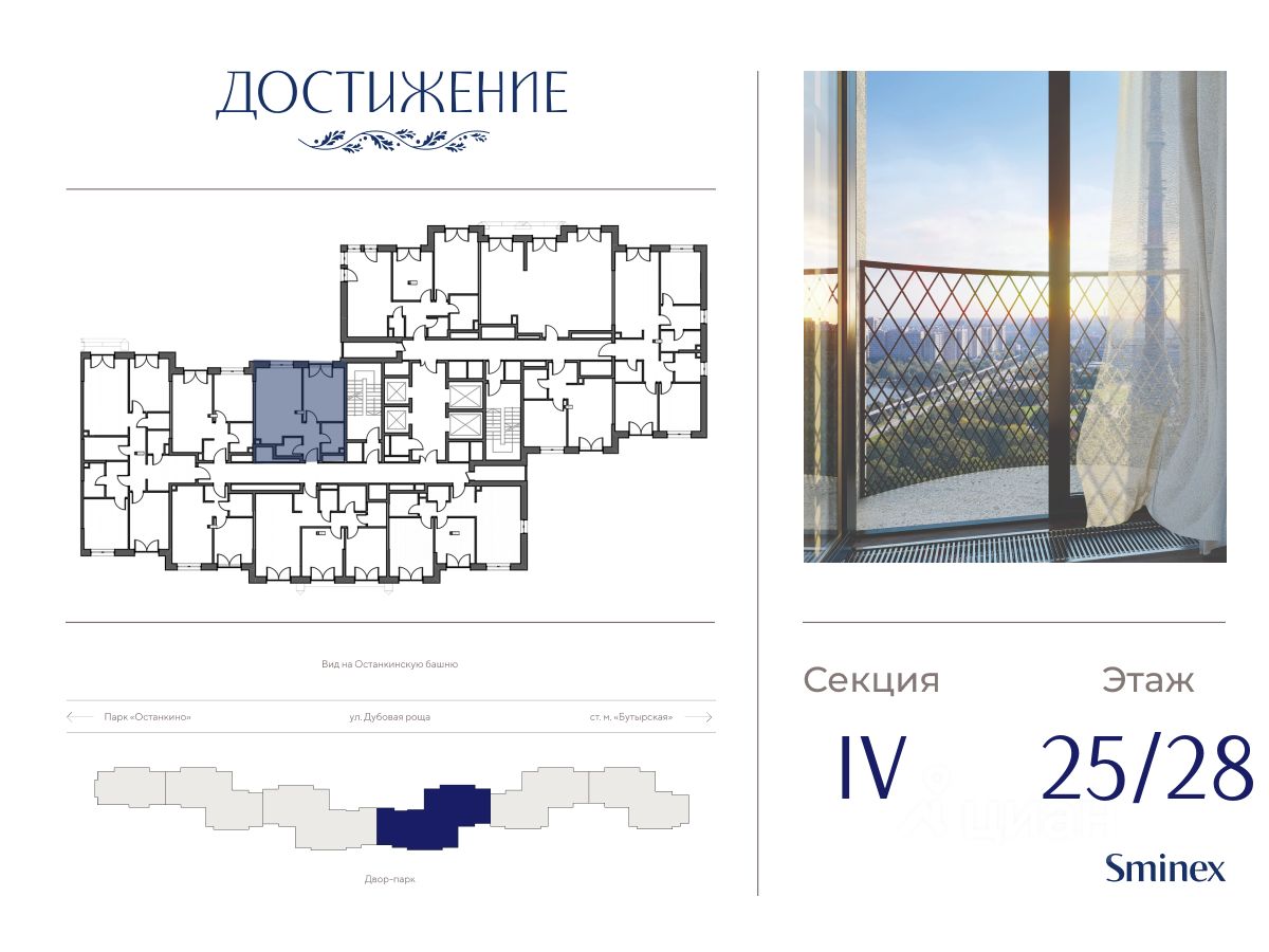 Квартира на две стороны света. Из окон открывается вид на променад и Останкинскую телебашню. Окна двух спален выходят с видом на двор-парк. ''Достижение'' - единственный дом с торжественной архитектурой в окружении бескрайних парков на любой вкус: парк ''Дубовая роща'', обновленный классический парк ''Останкино'', самый известный парк России ВДНХ и крупнейший в Европе ботанический сад. Дом находится в непосредственной близости от центра города: до Садового кольца на автомобиле - 15 минут, 700 м до станции метро ''Бутырская'', а от нее всего 3 станции на метро - и вы на Цветном бульваре. Архитектура проекта - современное прочтение торжественного и изящного стиля ар-деко, который, как и сталинский ампир, сформировался в результате развития идей чикагской школы. В доме 6 секций, 115 вариантов продуманных планировочных решений - от уютных студий до просторных пентхаусов с дровяным камином. В каждой квартире предусмотрен полный комплекс систем комфорта: принудительная центральная вентиляция с фильтрацией воздуха, очистка воды до уровня питьевой, круглогодичное горячее водоснабжение, быстрые бесшумные лифты, которые идут прямо в паркинг, продуманная подготовка под кондиционирование и другие технологические решения. В доме ''Достижение'' общественные пространства и квартира тоже гармонично дополняют друг друга, как части единого целого. Здесь есть инфраструктурный центр Clubhouse только для жителей, открывающий возможности для общения и детского развития: клубная гостиная жителей по стандарту Friend's Lab и детская игровая комната 250 кв.м. в концепции Kid's Lab. На площади 1,7 гектара создан живописный парк с террасным склоном, в котором растут луговые травы, кустарники и деревья. Пространство ландшафтного парка разделено на зоны для активного и спокойного отдыха с зелёными уголками для любителей тишины. Для спокойного отдыха: тихие места с беседками и шезлонгами, клубная гостиная в концепции Friend's Lab с открытой террасой и гамаками, зона для барбекю, смотровая галерея, уютный пруд, а также пять пеших маршрутов для променада. Для активного отдыха: универсальная многофункциональная спортивная площадка, отдельная зона для занятий workout и бесплатный фитнес-зал только для жителей по стандарту Fit Lab. В центральной части парка расположен амфитеатр со сценой для представлений и проведения мероприятий. Для гармоничного развития маленьких жителей - пространства по стандарту Kid's Lab для гармоничного развития детей всех возрастов: детская площадка, игровая комната, рельефная площадка для общения со сверстниками, где можно заниматься паркуром, танцевать и играть в настольный теннис.
