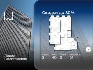 Цена указана с учётом скидки при 100%-й оплате, несубсидированной ипотеке, рассрочке (кроме программы ''Рассрочка 0%'').В жилом квартале, расположенном в южной части района Западное Дегунино, продаётся 3-комнатная квартира площадью 60.90 кв.м без отделки. Квартира расположена на 37 этаже 40-этажного корпуса 3 в жилом комплексе комфорт-класса Левел Селигерская (компания Level Group/Левел групп).Отличная транспортная доступность:- 10 мин. пешком до станции метро ''Верхние Лихоборы'',- 15 мин. пешком до станции метро ''Селигерская'',- 20 мин. пешком до станции МЦД-3 ''Моссельмаш'',- 11 мин. на авто до МКАД,- 13 мин. на авто до ТТК,- 16 мин. на авто до Садового кольца.РасположениеРайон отличается богатой социальной инфраструктурой: школы, детские сады, поликлиники, магазины, фитнес-клубы, торговые центры - всё близко к дому. Рядом с Левел Селигерская расположено 5 парковых зон. В 3 минутах от дома расположен перспективный сквер-парк. В 10 минутах пешком находится парк им. Святослава Фёдорова, в 13 минутах на велосипеде - парк ''Ангарские пруды''. В 7-11 минутах на автомобиле - два крупных природных объекта: Тимирязевский парк и Главный ботанический сад Российской академии наук.БлагоустройствоВнутренние дворы жилого комплекса огорожены от машин, а их функциональное наполнение отличается в зависимости от очереди строительства. На территории 2-й очереди жителей ждут уютные навесы с качелями, павильон-читальня, волейбольная площадка, беседки, а также детские и спортивные площадки.Технологии и инженерияДля входа на территорию комплекса предусмотрен единый ключ доступа. Все общественные зоны оснащены камерами видеонаблюдения, по заявке собственнику предоставляется возможность просмотра изображения отдельных видеокамер на его мобильном устройстве. При въезде в паркинг функционирует система распознавания госномеров. Кроме того, для комфорта жителей создано мобильное приложение, с помощью которого можно удаленно контролировать доступ на придомовую и жилую территории.Другие преимущества жилого комплекса- Высокая освещённость квартир: в большинстве из них не менее трёх окон,- Супермаркет, магазины, кафе, пекарни и многое другое на первых этажах домов,- Частный детский сад,- Стильные дизайнерские лобби с высокими потолками до 4,3 м. и окнами в пол, для питомцев предусмотрена лапомойка,- 30+ планировочных решений: от компактных студий до просторных семейных квартир,- С каждого этажа дома на лифте можно спуститься в подземный отапливаемый паркинг.''