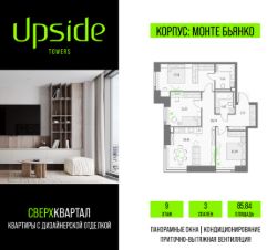 Продаётся 3-комнатная квартира площадью 85.84 кв.м на 9 этаже 46 этажного корпуса Монте Бьянко в квартале небоскребов ''Upside Towers''. Квартира с чистовой отделкой, c видом на Корпус Олимп, корпус Эльбрус, Бизнес-парк Останкино, прогулочный бульвар, детский сад, школу, Останкинскую Башню. Номер квартиры Г0913.Upside Towers - технологичный квартал строится в динамично развивающемся Бутырском районе, в 3 мин. от метро, в 5 мин. от ТТК. На территории 7 га возводится 5 высотных башен от 19 до 58 этажей, названных в честь главных вершин земли. Квартиры с панорамными окнами в пол, высокими потолками и современными инженерными решениями. Благоустроенная зеленая территория включает: приватные дворы, природный комплекс, прогулочный бульвар, ландшафтный парк 2,5 га с сенсорным садом и многофункциональными игровыми и спортивными площадками. В корпусе откроется смотровая площадка для резидентов с панорамными видами на город, парки, Останкинскую башню, ВДНХ, Ботанический сад и Москву-Сити.На первых этажах корпуса Монте Бьянко разместятся: фитнес студия, салон красоты, центр превентивной медицины, образовательные классы, книжный магазин, аптека, фермерская лавка, а также келлеры для хранения сезонных вещей. В приватном закрытом дворе разместятся разнообразные площадки для прогулок, игр и отдыха. Визитной карточкой двора станет уникальная биометрическая игровая пещера со сказочными тоннелями, горками и космическими ''мягкими'' камнями с неизведанных планет. Планету Земля дети смогут исследовать в павильоне круглый год: объемная крыша укроет от солнца и дождя. Игровая пещера будет реализована в стиле ''эмоциональная архитектура''. Большое внимание в проекте уделяется созданию социальной инфраструктуры. В стилобатной части, между корпусами ''Атлас'' и ''Олимп'' разместится уникальное пространство закрытый клуб для жителей квартала Upside Club площадью 2 000 кв. м. Здесь разместятся: каминный зал с роялем, многофункциональная детская зона c двухуровневым игровым оборудованием для малышей и дошкольников, плей-рум для подростков, домашний кинотеатр, коворкинг, переговорные и лектории. На 47 этаже башни ''Атлас'' откроется SKY SPA Relax с расслабляющей атмосферой, джакузи, сауной, залами для релаксации и йоги. Собственники квартир смогут в любое удобное для них время забронировать посещение спа-зоны через смарт-приложение. На крыше стилобата разместится всесезонная BBQ патио-зона с верандой и закрытыми помещениями для приготовления и отдыха. Покупая квартиру даже самого минимального размера в Upside Towers, вы получаете в пользование 2 000 м² бесплатных общественных пространств.В рамках проекта строится государственная школа и детский сад, разместится более 15 000 кв.м. коммерческой инфраструктуры. Насыщенная социальная инфраструктура формирует множество сценариев для жизни на территории квартала. В Upside Towers применяются лучшие технологии и практики, чтобы обеспечить высшее качество жизни: Воздух, не уступающий по качеству горному, обеспечит приточно-выт