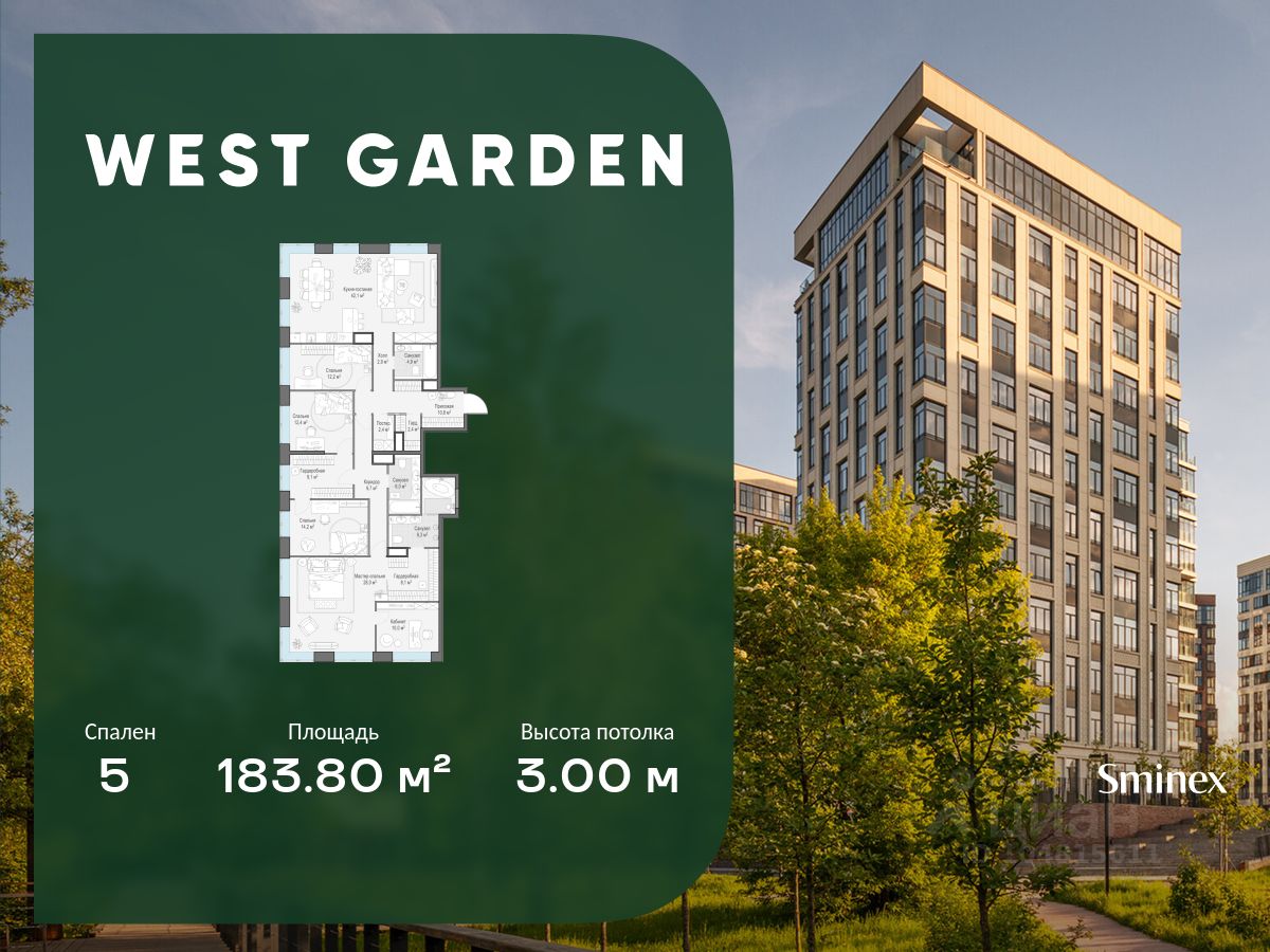 Комфортная и продуманная до мелочей многокомнатная квартира площадью 183.80 кв. м на 13 этаже в клубном доме 16. Увеличенная площадь окон и высота потолков 3.00 м дарят впечатляющие виды на парки, зеленые зоны и природные заказники. West Garden - это собрание клубных домов высотой 12-14 этажей в собственном парке 16 гектаров вдоль реки. Просторный среднеэтажный квартал расположен на Минской улице, в респектабельном Западном округе столицы. Вокруг премиальное окружение и более 1000 гектаров парков. West Garden - это возможность обеспечить себе и своей семье лучшие условия для жизни в одном из самых привлекательных и зелёных районов столицы. Гармония природы дополнена здесь впечатляющими возможностями и привилегиями: • Расположение в зелёном Западном районе столицы вблизи центра и ключевых магистралей в окружении парковых зон (заказник ''Долина реки Сетунь'', Мосфильмовский пруд, Ботанический сад МГУ, природный заказник ''Воробьёвы Горы'', Парк Победы на Поклонной горе) • Современная лаконичная архитектура, у каждого дома свой индивидуальный облик и выразительный фасад с использованием натуральных и долговечных материалов (гранит, известняк, клинкерный кирпич) • Функциональные лобби с отделкой из дерева и натурального камня с высокими потолками до 7,8 м • Самый большой собственный парк для прогулок и отдыха: 8 га собственной закрытой и благоустроенной территории, а также 8 га прилегающего парка на набережной с зонами отдыха с шезлонгами, маршрутами для бега, пеших и велосипедных прогулок • Инфраструктурный центр Clubhouse только для жителей: клубная гостиная с террасой и творческой атмосферой по фирменному стандарту Friend's Lab, детская игровая зона 300 кв. м по стандарту Kid's Lab • Насыщенная и разнообразная инфраструктура для детей любого возраста: 8 развивающих детских площадок в парке, 3 детские площадки на благоустроенной набережной, площадка для отдыха и досуга подростков • Спортивная инфраструктура по стандарту Fit Lab: многофункциональные площадки для футбола, баскетбола, волейбола с трибуной для болельщиков, зона воркаута, теннисные столы, зона для йоги, беговая дорожка 3 километра, фитнес-центр только для жителей • Комфортный и просторный подземный паркинг на 1313 машино-мест, 482 келлера, автомойка только для жителей на четыре поста