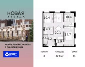 Продаётся 3-к квартира 72.8 кв.м. на 13-м этаже 22 этажного дома, корпус 6 - Резиденция ''Хабаровск''. Без отделки. Легендарный квартал ''Новая звезда'' продолжается II очередью, которая спроектирована как мультифункциональный кластер. ЖК ''Новая Звезда'' расположен на территории Новой Москвы, в 10 мин. от м. Теплый стан и в 9 мин. пешком от строящейся станции метро ''Бачуринская''. Дизайн квартала спроектирован так, чтобы создать 2 города — Гостиный двор и комплекс жилых резиденций.Гостиный двор это стилобат, в котором разместятся рестораны, магазины, спортивные секции, детские кружки. Это место для активной городской жизни прямо в вашем квартале. Гостиный двор, безусловно, является уникальным форматом организации общественной жизни, предлагая жителям квартала весь необходимый спектр услуг в шаговой доступности от дома..Жителям II очереди квартала ''Новая звезда'' будут доступны все инфраструктурные преимущества единого квартала:- образовательный кластер с уже построенной инновационной школой нового поколения,- спортивная инфраструктура,- торговые площади с услугами на первых этажах жилых домов.Прямая продажа от застройщика ООО СЗ ''ГСД''.