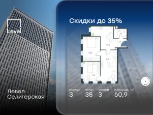 Цена указана с учётом скидки при 100%-й оплате, несубсидированной ипотеке, рассрочке (кроме программы ''Рассрочка 0%'').В жилом квартале, расположенном в южной части района Западное Дегунино, продаётся 3-комнатная квартира площадью 60.90 кв.м без отделки. Квартира расположена на 37 этаже 40-этажного корпуса 3 в жилом комплексе комфорт-класса Левел Селигерская (компания Level Group/Левел групп).Отличная транспортная доступность:- 10 мин. пешком до станции метро ''Верхние Лихоборы'',- 15 мин. пешком до станции метро ''Селигерская'',- 20 мин. пешком до станции МЦД-3 ''Моссельмаш'',- 11 мин. на авто до МКАД,- 13 мин. на авто до ТТК,- 16 мин. на авто до Садового кольца.РасположениеРайон отличается богатой социальной инфраструктурой: школы, детские сады, поликлиники, магазины, фитнес-клубы, торговые центры - всё близко к дому. Рядом с Левел Селигерская расположено 5 парковых зон. В 3 минутах от дома расположен перспективный сквер-парк. В 10 минутах пешком находится парк им. Святослава Фёдорова, в 13 минутах на велосипеде - парк ''Ангарские пруды''. В 7-11 минутах на автомобиле - два крупных природных объекта: Тимирязевский парк и Главный ботанический сад Российской академии наук.БлагоустройствоВнутренние дворы жилого комплекса огорожены от машин, а их функциональное наполнение отличается в зависимости от очереди строительства. На территории 2-й очереди жителей ждут уютные навесы с качелями, павильон-читальня, волейбольная площадка, беседки, а также детские и спортивные площадки.Технологии и инженерияДля входа на территорию комплекса предусмотрен единый ключ доступа. Все общественные зоны оснащены камерами видеонаблюдения, по заявке собственнику предоставляется возможность просмотра изображения отдельных видеокамер на его мобильном устройстве. При въезде в паркинг функционирует система распознавания госномеров. Кроме того, для комфорта жителей создано мобильное приложение, с помощью которого можно удаленно контролировать доступ на придомовую и жилую территории.Другие преимущества жилого комплекса- Высокая освещённость квартир: в большинстве из них не менее трёх окон,- Супермаркет, магазины, кафе, пекарни и многое другое на первых этажах домов,- Частный детский сад,- Стильные дизайнерские лобби с высокими потолками до 4,3 м. и окнами в пол, для питомцев предусмотрена лапомойка,- 30+ планировочных решений: от компактных студий до просторных семейных квартир,- С каждого этажа дома на лифте можно спуститься в подземный отапливаемый паркинг.''