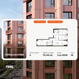 Продаётся 3-комн. квартира площадью 79,5 кв.м на 3 этаже 16 этажного дома (Корпус 57.4, Секция 4) проекта ПИК Саларьево парк. Светлый просторный подъезд на уровне земли, функциональная планировка, большие окна, предчистовая отделка. Жилой район ''Саларьево парк'' расположен в Новой Москве, в четырёх километрах от МКАД по Киевскому шоссе. Две станции метро: ''Саларьево'' и ''Филатов луг'', — находятся в пешей доступности от проекта. Дойти до них можно за 510 минут. В квартале уже создана качественная среда, где есть абсолютно всё для полноценной жизни, работы и отдыха. Благодаря удобному расположению проекта всё важное будет рядом: детские сады, школы, кафе и рестораны, шопинг в торговых центрах, фитнес и даже аэропорт. Все корпуса в квартале гармонично сочетаются, образуя единую городскую среду. Между собой их объединяет невысокая этажность и натуральная цветовая гамма. Здесь приятно гулять и проводить время на улице всей семьёй. В ''Саларьево парке'' создана уникальная образовательная среда, включающая в себя шесть школ, рассчитанных на 6 250 учеников. Две из них уже открыты, их посещает 2 300 детей. Также на территории ''Саларьево парка'' находится 12 детских садов, один из которых с бассейном. Сейчас уже открыты 7 садов. В ''Саларьево парке'' открыта уникальная игровая площадка — PlayHub ''Оригами''. Здесь есть ручей, горка-труба и рельефные холмы. Взрослые смогут отдохнуть в уютном кафе, пока дети играют. Также на территории проекта есть SportHub — большая спортивная зона, разделённая по интересам и возрастам. Здесь можно заниматься разными видами спорта: футболом, баскетболом, волейболом и стритболом. Зимой центральную часть площадки превращают в каток. Во дворах-парках жилого квартала есть места для отдыха, детские и спортивные площадки. На первых этажах домов расположены магазины, кафе и полезные сервисы. Также вблизи проекта есть несколько масштабных торговых центров. До ТЦ ''Саларис'' пять минут пешком, до ''Рио'', Metro Cash & Carry и ''Леруа Мерлен'' — пять минут на автомобиле. Артикул 1018547 (Застройщик ООО ''Специализированный Застройщик ''Тирон'')