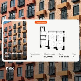 Продаётся 3-комн. квартира площадью 71,5 кв.м на 9 этаже 16 этажного дома (Корпус 2.1.2, Секция 2) проекта ПИК Середневский лес. Светлый просторный подъезд на уровне земли, функциональная планировка, большие окна, c отделкой. В 10 минутах на автомобиле находится станция метро ''Внуково'', а в 15 минутах — станции ''Филатов Луг'' и ''Саларьево''. От них до центра Москвы всего 3540 минут. На рейсовом автобусе от жилого квартала до метро ''Филатов Луг'' — 20 минут. На территории ''Середневского леса'' появилось общественное пространство с игровыми площадками, местами для отдыха, пешеходными маршрутами и велопарковкой — для прогулок, отдыха и встреч жителей квартала. Также внутри жилого квартала уже открыта школа на 1100 мест и детский сад для 325 малышей. В дальнейшем откроется ещё один сад для 340 детей. Артикул 1037822 (Застройщик ООО ''Специализированный застройщик Середнево'')