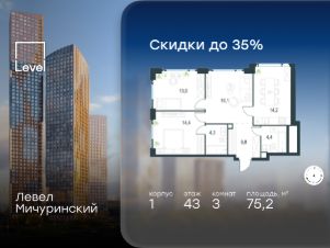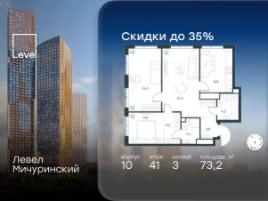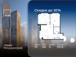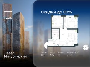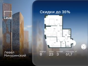 Цена указана с учётом скидки при 100%-й оплате, несубсидированной ипотеке, рассрочке (кроме программы ''Рассрочка 0%''). В жилом квартале, расположенном на границе с природным заказником ''Долина реки Очаковки'', продаётся 3-комнатная квартира площадью 58.00 кв.м с отделкой white box. Квартира расположена на 17 этаже 42-этажного корпуса 10 в жилом комплексе бизнес-класса Левел Мичуринский (компания Level Group/Левел групп). Отличная транспортная доступность: - от 10 мин. пешком до станции метро ''Мичуринский проспект''- 15 мин. пешком до станции метро ''Аминьевская''- 7 мин. на авто до МКАД- 10 мин. на авто до ТТК- 15 мин. на авто до Москва-Сити Продуманный архитектурный проект:- Выразительная архитектура от известных бюро: корпуса 1-6 - СПИЧ, корпуса 7-13 - Borisov Architects,- Из окон открываются живописные виды на парки, Москва-Сити и МГУ,- Высокие потолки до 6,35 м,- Стильные лобби с окнами в пол и высокими потолками до 4,7 м,- С каждого этажа дома на лифте можно спуститься в подземный отапливаемый паркинг.Расположение:Жилой комплекс Левел Мичуринский строится в одном из самых зелёных районов Москвы - Очаково-Матвеевское. Этот уголок столицы идеален для поддержания здорового образа жизни. В шаговой доступности от проекта находятся заказник ''Долина реки Очаковки'' - 1 мин. пешком и Очаковский парк - 7 мин. пешком. На велосипеде можно добраться до таких парков, как ''Событие'', парк Олимпийской деревни, парк 50-летия Октября и парк Школьников.В 15 минутах езды на авто расположено более 30 детских садов (из них 14 в пешей доступности), 32 школы (из них 13 в пешей доступности) и 14 вузов. Также в ближайшем окружении - более 25 медицинских учреждений, 11 спортивных клубов и 22 продуктовых супермаркета.Внутренняя инфраструктура:На территории жилого комплекса строится три детских сада и школа. На первых этажах домов откроется супермаркет, фитнес-центр, ресторан, кафе и другие сервисы. Подземные этажи займут паркинги: трёхуровневые - в этапах 1 и 2, одноуровневый - в этапах 3 и 4.Преимущества проекта:- 4,5 га благоустроенной территории с видовым мостом, уличным кинотеатром, зонами для тихого отдыха, работы, воркаута, площадки для петанка, футбола, настольного тенниса и пляжного волейбола.- Дизайнерские лобби с панорамным видом на двор, мойками для лап животных и комфортными зонами ожидания.- Безопасность жителей: круглосуточное видеонаблюдение всех зон общего пользования (лобби, лифты, паркинги, детские площадки), система контроля доступа, управление видеодомофоном через мобильное приложение, единый ключ доступа на территорию жилого комплекса.- Технологии и комфорт: высокоскоростной Wi-Fi в лобби и на придомовой территории, автоматическая система контроля и учёта ресурсов, абонентская связь с консьержем, распознавание номеров автомобилей при въезде в паркинг и выезде из него.