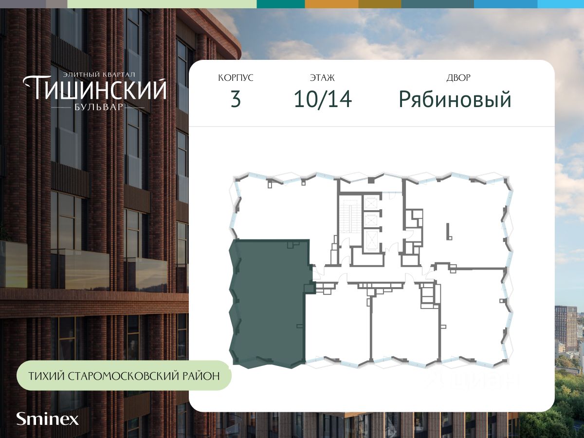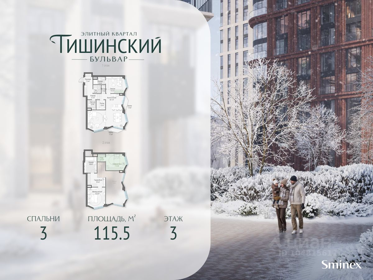 В продаже 3-комнатная квартира квартира в элитном квартале ''Тишинский бульвар''. Общая площадь квартиры - 115.50 кв.м. Этаж 3 из 14. Корпус Рябиновый 3. ''Тишинский бульвар'' - тихий зелёный элитный квартал на Тишинке, в престижном и комфортном районе центра Москвы. В нём создан уникальный для элитного дома прогулочный бульвар в своём огромном парке 1,9 га. В парке оборудованы зоны для активного и тихого отдыха, крытые галереи, приватные зелёные комнаты, многофункциональная спортивная площадка, воркаут-зона, детская площадка, сухой фонтан, ручей. В пешей доступности Римско-католический кафедральный собор. Всего в полутора километрах от квартала находятся Патриаршие пруды - излюбленное место для летних прогулок, воскресных бранчей и романтических ужинов. Белая площадь расположена ещё ближе - на расстоянии 1,2 километра. Это точка концентрации деловой жизни и модных ресторанов. В ''Тишинский бульваре'' только для жителей и их гостей создан уникальный для элитного дома прогулочный бульвар в собственном огромном парке площадью 2,1 га, который занимает 70% территории квартала. Бульвар проходит через весь квартал и объединяет в общее пространство три двора: Кленовый, Рябиновый и Ивовый. В парке созданы крытые галереи и приватные зелёные комнаты для отдыха и медитаций в любую погоду. Насыщенное озеленение многолетними растениями с разными периодами цветения сохраняет территорию квартала красивой круглый год. В квартале насыщенная инфраструктура только для жителей, включая Clubhouse. Здесь оборудованы пространства для здорового образа жизни по стандарту FIT LAB: в парке - многофункциональная спортивная площадка, воркаут-зона, место для занятий йогой и медитации, бесплатный фитнес-клуб с бассейном. Для маленьких жителей доступны детская площадка и игровая комната по стандарту KIDS LAB. Дома оснащены самыми полными и лучшими системами.
