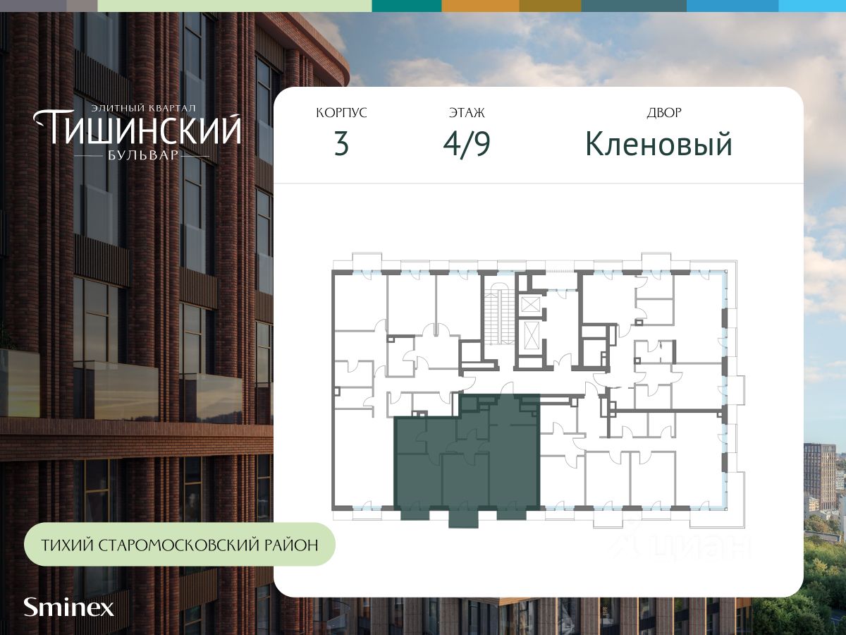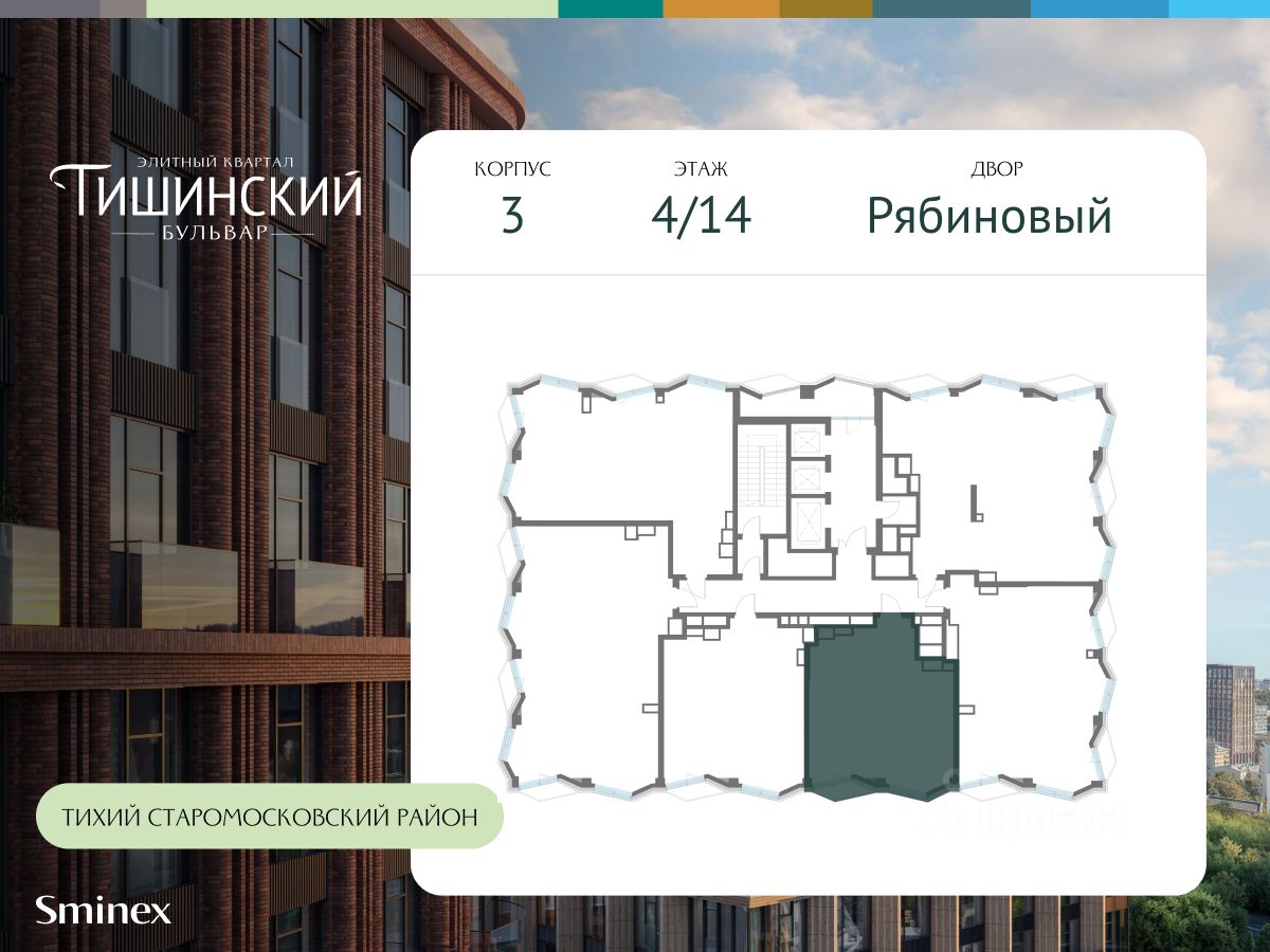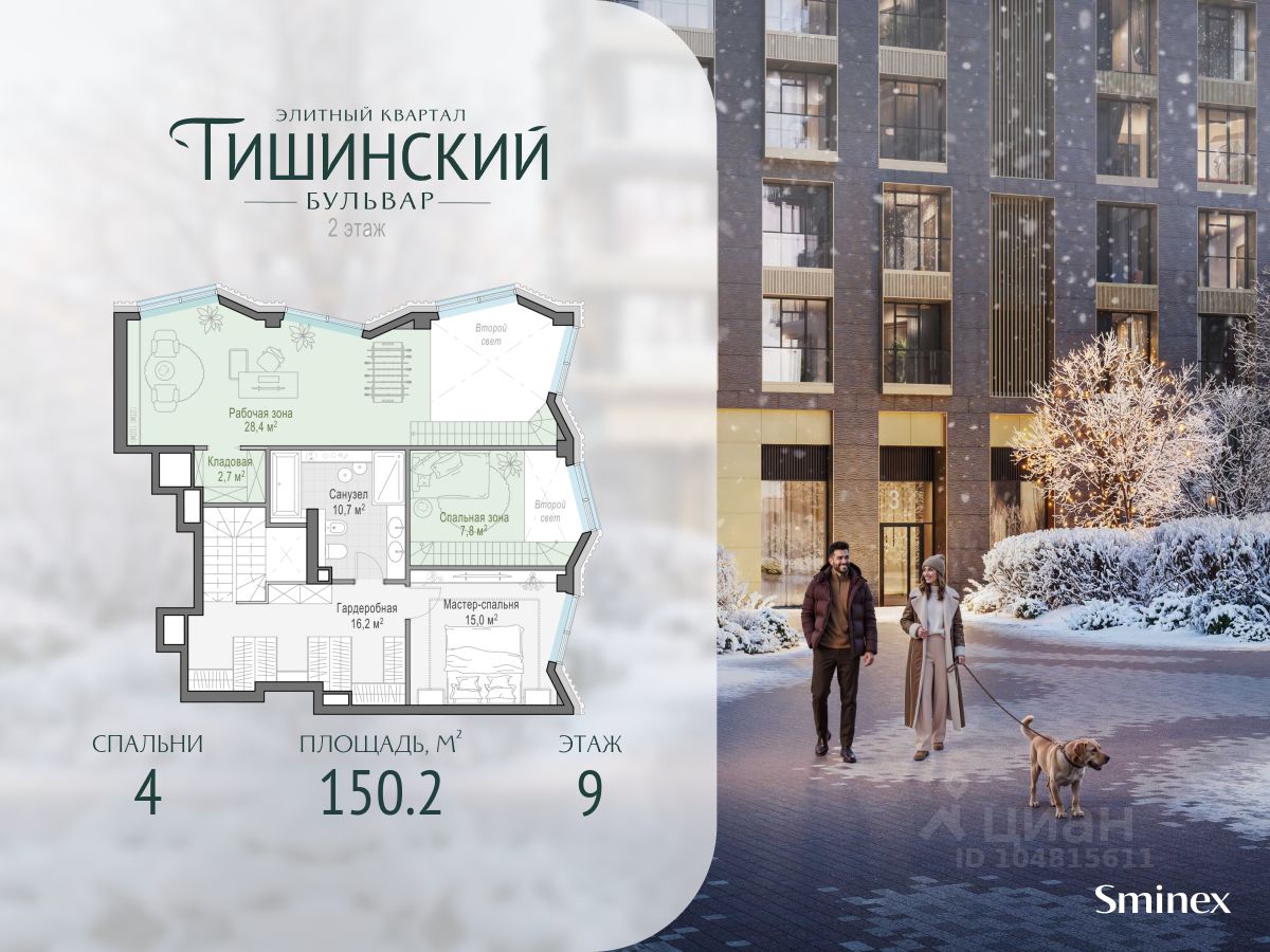 В продаже 4-комнатная квартира квартира в элитном квартале ''Тишинский бульвар''. Общая площадь квартиры - 150.20 кв.м. Этаж 9 из 14. Корпус Рябиновый 3. ''Тишинский бульвар'' - тихий зелёный элитный квартал на Тишинке, в престижном и комфортном районе центра Москвы. В нём создан уникальный для элитного дома прогулочный бульвар в своём огромном парке 1,9 га. В парке оборудованы зоны для активного и тихого отдыха, крытые галереи, приватные зелёные комнаты, многофункциональная спортивная площадка, воркаут-зона, детская площадка, сухой фонтан, ручей. В пешей доступности Римско-католический кафедральный собор. Всего в полутора километрах от квартала находятся Патриаршие пруды - излюбленное место для летних прогулок, воскресных бранчей и романтических ужинов. Белая площадь расположена ещё ближе - на расстоянии 1,2 километра. Это точка концентрации деловой жизни и модных ресторанов. В ''Тишинский бульваре'' только для жителей и их гостей создан уникальный для элитного дома прогулочный бульвар в собственном огромном парке площадью 2,1 га, который занимает 70% территории квартала. Бульвар проходит через весь квартал и объединяет в общее пространство три двора: Кленовый, Рябиновый и Ивовый. В парке созданы крытые галереи и приватные зелёные комнаты для отдыха и медитаций в любую погоду. Насыщенное озеленение многолетними растениями с разными периодами цветения сохраняет территорию квартала красивой круглый год. В квартале насыщенная инфраструктура только для жителей, включая Clubhouse. Здесь оборудованы пространства для здорового образа жизни по стандарту FIT LAB: в парке - многофункциональная спортивная площадка, воркаут-зона, место для занятий йогой и медитации, бесплатный фитнес-клуб с бассейном. Для маленьких жителей доступны детская площадка и игровая комната по стандарту KIDS LAB. Дома оснащены самыми полными и лучшими системами.
