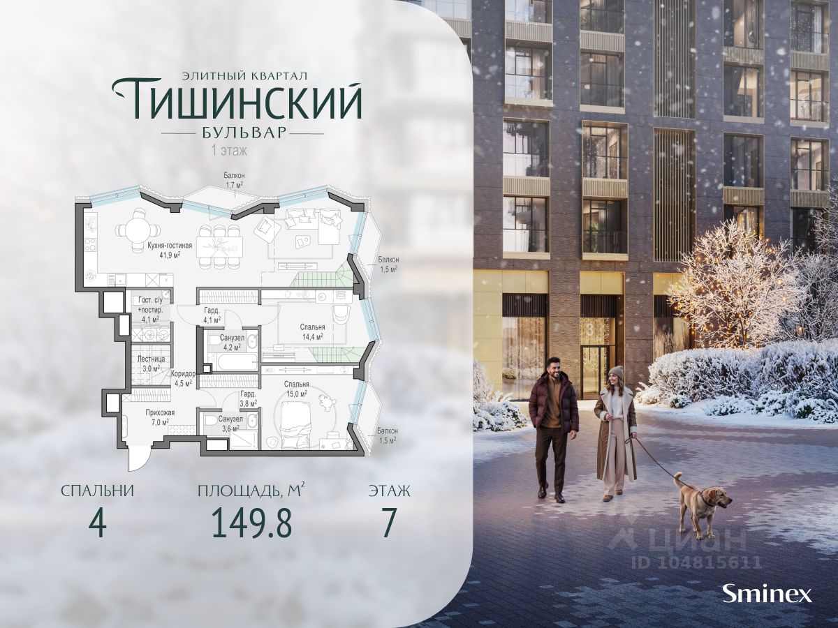 В продаже 4-комнатная квартира квартира в элитном квартале ''Тишинский бульвар''. Общая площадь квартиры - 149.80 кв.м. Этаж 7 из 14. Корпус Рябиновый 3. ''Тишинский бульвар'' - тихий зелёный элитный квартал на Тишинке, в престижном и комфортном районе центра Москвы. В нём создан уникальный для элитного дома прогулочный бульвар в своём огромном парке 1,9 га. В парке оборудованы зоны для активного и тихого отдыха, крытые галереи, приватные зелёные комнаты, многофункциональная спортивная площадка, воркаут-зона, детская площадка, сухой фонтан, ручей. В пешей доступности Римско-католический кафедральный собор. Всего в полутора километрах от квартала находятся Патриаршие пруды - излюбленное место для летних прогулок, воскресных бранчей и романтических ужинов. Белая площадь расположена ещё ближе - на расстоянии 1,2 километра. Это точка концентрации деловой жизни и модных ресторанов. В ''Тишинский бульваре'' только для жителей и их гостей создан уникальный для элитного дома прогулочный бульвар в собственном огромном парке площадью 2,1 га, который занимает 70% территории квартала. Бульвар проходит через весь квартал и объединяет в общее пространство три двора: Кленовый, Рябиновый и Ивовый. В парке созданы крытые галереи и приватные зелёные комнаты для отдыха и медитаций в любую погоду. Насыщенное озеленение многолетними растениями с разными периодами цветения сохраняет территорию квартала красивой круглый год. В квартале насыщенная инфраструктура только для жителей, включая Clubhouse. Здесь оборудованы пространства для здорового образа жизни по стандарту FIT LAB: в парке - многофункциональная спортивная площадка, воркаут-зона, место для занятий йогой и медитации, бесплатный фитнес-клуб с бассейном. Для маленьких жителей доступны детская площадка и игровая комната по стандарту KIDS LAB. Дома оснащены самыми полными и лучшими системами.