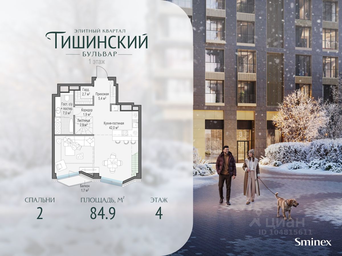 В продаже 2-комнатная квартира квартира в элитном квартале ''Тишинский бульвар''. Общая площадь квартиры - 84.90 кв.м. Этаж 4 из 14. Корпус Рябиновый 3. ''Тишинский бульвар'' - тихий зелёный элитный квартал на Тишинке, в престижном и комфортном районе центра Москвы. В нём создан уникальный для элитного дома прогулочный бульвар в своём огромном парке 1,9 га. В парке оборудованы зоны для активного и тихого отдыха, крытые галереи, приватные зелёные комнаты, многофункциональная спортивная площадка, воркаут-зона, детская площадка, сухой фонтан, ручей. В пешей доступности Римско-католический кафедральный собор. Всего в полутора километрах от квартала находятся Патриаршие пруды - излюбленное место для летних прогулок, воскресных бранчей и романтических ужинов. Белая площадь расположена ещё ближе - на расстоянии 1,2 километра. Это точка концентрации деловой жизни и модных ресторанов. В ''Тишинский бульваре'' только для жителей и их гостей создан уникальный для элитного дома прогулочный бульвар в собственном огромном парке площадью 2,1 га, который занимает 70% территории квартала. Бульвар проходит через весь квартал и объединяет в общее пространство три двора: Кленовый, Рябиновый и Ивовый. В парке созданы крытые галереи и приватные зелёные комнаты для отдыха и медитаций в любую погоду. Насыщенное озеленение многолетними растениями с разными периодами цветения сохраняет территорию квартала красивой круглый год. В квартале насыщенная инфраструктура только для жителей, включая Clubhouse. Здесь оборудованы пространства для здорового образа жизни по стандарту FIT LAB: в парке - многофункциональная спортивная площадка, воркаут-зона, место для занятий йогой и медитации, бесплатный фитнес-клуб с бассейном. Для маленьких жителей доступны детская площадка и игровая комната по стандарту KIDS LAB. Дома оснащены самыми полными и лучшими системами.