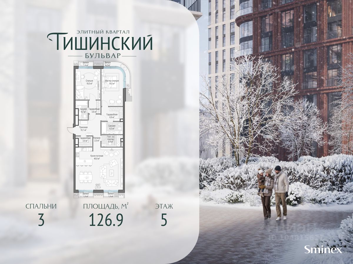 В продаже 3-комнатная квартира квартира в элитном квартале ''Тишинский бульвар''. Общая площадь квартиры - 126.90 кв.м. Этаж 5 из 14. Корпус Ивовый 6. ''Тишинский бульвар'' - тихий зелёный элитный квартал на Тишинке, в престижном и комфортном районе центра Москвы. В нём создан уникальный для элитного дома прогулочный бульвар в своём огромном парке 1,9 га. В парке оборудованы зоны для активного и тихого отдыха, крытые галереи, приватные зелёные комнаты, многофункциональная спортивная площадка, воркаут-зона, детская площадка, сухой фонтан, ручей. В пешей доступности Римско-католический кафедральный собор. Всего в полутора километрах от квартала находятся Патриаршие пруды - излюбленное место для летних прогулок, воскресных бранчей и романтических ужинов. Белая площадь расположена ещё ближе - на расстоянии 1,2 километра. Это точка концентрации деловой жизни и модных ресторанов. В ''Тишинский бульваре'' только для жителей и их гостей создан уникальный для элитного дома прогулочный бульвар в собственном огромном парке площадью 2,1 га, который занимает 70% территории квартала. Бульвар проходит через весь квартал и объединяет в общее пространство три двора: Кленовый, Рябиновый и Ивовый. В парке созданы крытые галереи и приватные зелёные комнаты для отдыха и медитаций в любую погоду. Насыщенное озеленение многолетними растениями с разными периодами цветения сохраняет территорию квартала красивой круглый год. В квартале насыщенная инфраструктура только для жителей, включая Clubhouse. Здесь оборудованы пространства для здорового образа жизни по стандарту FIT LAB: в парке - многофункциональная спортивная площадка, воркаут-зона, место для занятий йогой и медитации, бесплатный фитнес-клуб с бассейном. Для маленьких жителей доступны детская площадка и игровая комната по стандарту KIDS LAB. Дома оснащены самыми полными и лучшими системами.
