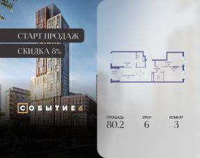 Скидка до 8% действует до 09.02.2026 г. при 100% оплате и не субсидированной ипотеке.Продаётся 3-комнатная квартира от застройщика: общая площадь 80.20 м², жилая 42.80 м², кухня 20.70 м², 6-й этаж, жилой квартал ''Событие-6'', корпус 2 (секция 3) Срок сдачи: 1 квартал 2029 года.Позвоните сейчас и забронируйте квартиру! Продуманный до деталей. Созданный для жизни, полной счастливых событий. Парк-квартал СОБЫТИЕ - это жизнь класса премиум в престижном районе на Мосфильмовской улице.Архитектура мирового уровня. Выигрышное расположение на границе природного комплекса ''Долина реки Раменки''. Все для комфортной жизни и досуга: от детсадов и школ до ресторанов и медцентров. И новая точка притяжения - уже готовый парк ''Событие'' с пространствами активности для всех возрастов и интересов. Особенности квартала:• ''Парящие'' мосты и парк под облаками - уникальный дом с самыми завораживающими видами из окон ''в пол''• Собственный парк - сразу за порогом!• Архитектурная концепция от известных международных бюро LDA Design и UHA London• Инфраструктура ''тапочной доступности'': в кафе, школу, магазин - за пару минут!• Внутренний двор - настоящее продолжение вашего дома: закрытая охраняемая территория без машин, развивающие детские площадки, воркауты-зоны для тех, кто хочет быть в форме, площади для праздников и посиделок с соседями.