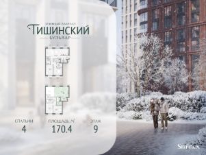В продаже 4-комнатная квартира квартира в элитном квартале ''Тишинский бульвар''.Общая площадь квартиры - 170.40 кв.м. Этаж 9 из 11.Корпус К4С2.''Тишинский бульвар'' - тихий зелёный элитный квартал на Тишинке, в престижном и комфортном районе центра Москвы. В нём создан уникальный для элитного дома прогулочный бульвар в своём огромном парке 1,9 га. В парке оборудованы зоны для активного и тихого отдыха, крытые галереи, приватные зелёные комнаты, многофункциональная спортивная площадка, воркаут-зона, детская площадка, сухой фонтан, ручей.В пешей доступности Римско-католический кафедральный собор. Всего в полутора километрах от квартала находятся Патриаршие пруды - излюбленное место для летних прогулок, воскресных бранчей и романтических ужинов. Белая площадь расположена ещё ближе - на расстоянии 1,2 километра. Это точка концентрации деловой жизни и модных ресторанов.В ''Тишинский бульваре'' только для жителей и их гостей создан уникальный для элитного дома прогулочный бульвар в собственном огромном парке площадью 2,1 га, который занимает 70% территории квартала. Бульвар проходит через весь квартал и объединяет в общее пространство три двора: Кленовый, Рябиновый и Ивовый.В парке созданы крытые галереи и приватные зелёные комнаты для отдыха и медитаций в любую погоду. Насыщенное озеленение многолетними растениями с разными периодами цветения сохраняет территорию квартала красивой круглый год.В квартале насыщенная инфраструктура только для жителей, включая Clubhouse. Здесь оборудованы пространства для здорового образа жизни по стандарту FIT LAB: в парке - многофункциональная спортивная площадка, воркаут-зона, место для занятий йогой и медитации, бесплатный фитнес-клуб с бассейном. Для маленьких жителей доступны детская площадка и игровая комната по стандарту KIDS LAB.Дома оснащены самыми полными и лучшими системами.