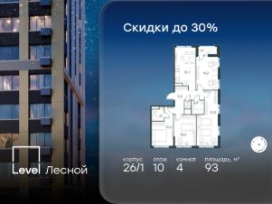 Цена указана с учётом скидки при 100%-й оплате, несубсидированной ипотеке, рассрочке (кроме программы ''Рассрочка 0%'').В районе, утопающем в густой зелени лесов, многочисленных парков и скверов, продаётся 4-комнатная квартира площадью 95.20 кв.м с отделкой white box. Квартира расположена на 6 этаже в жилом комплексе комфорт-класса Level Лесной (компания Level Group/Левел групп). Отличная транспортная доступность:- 25 мин. пешком до станции метро ''Пятницкое шоссе'',- 28 мин. на автобусе до станции метро и МЦД-2 ''Волоколамская'',- 11 мин. на авто до МКАД,- 25 мин. на авто до ТТК. Продуманный архитектурный проект:- Концепция проекта Level Лесной от бюро СПИЧ,- Высотность комплекса до 15 этажей с уникальными видами на лесные массивы и город, - Высота потолков до 3 м,- Современные окна высотой до 1,6 м, в части квартир предусмотрены окна в пол. Высота подоконников 0,6 м, Расположение:Level Лесной строится в зелёной зоне ближайшего Подмосковья, г.о. Красногорск в посёлке Отрадное. Шаговая и автомобильная доступность до метро и больших транспортных артерий города. За 25 минут вы дойдёте до станции метро ''Пятницкое шоссе'', а за 20 минут на машине сможете доехать до станции метро ''Тушинская''. Район окружен роскошной зеленью лесов и парковых зон, занимающих территорию свыше 1 000 гектаров. Помимо благоприятной экологии, здесь множество возможностей для активного отдыха и поддержания физической формы. Облагороженная территории с полностью развитой инфраструктурой. На территории проекта находится детский сад и школа ''Светлые Горы'', которая входит в список лучших частных школ от Forbes Education (по данным на 2023г.). Кроме того, в пешей доступности расположено ещё 8 детских садов, а также запланировано открытие современной муниципальной школы. В непосредственной близости находятся сетевые супермаркеты и локальные магазины, аптеки, клиники, почта, библиотека, салоны красоты, рестораны, спортивные и творческие секции, развивающие детские центры. В 12 минутах пешком расположен торговый парк ''Отрада'' с продуктовым и строительным гипермаркетами, магазинами, кинотеатром и развлечениями для детей. Внутренняя инфраструктура:Мы знаем, как важно, чтобы магазины и сервисы были всегда рядом. В сданных корпусах Level Лесной уже расположена полностью готовая развитая инфраструктура. На первых этажах корпуса 27 предусмотрено ещё 14 коммерческих помещений. Благоустройство:Продуманное пространство и аура приватного европейского городка рождают чувство лёгкости и расслабления у каждого, кто попадает на территорию проекта. Концепцию общественных площадок разработали в партнёрстве два архитектурных бюро: Highlight Architecture и SCAPE. В безопасных дворах без машин каждый обязательно найдёт себе место для вдохновения, отдыха и спорта.