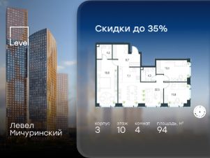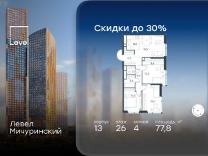 Цена указана с учётом скидки при 100%-й оплате, несубсидированной ипотеке, рассрочке (кроме программы ''Рассрочка 0%''). В жилом квартале, расположенном на границе с природным заказником ''Долина реки Очаковки'', продаётся 4-комнатная квартира площадью 95.80 кв.м с отделкой white box. Квартира расположена на 22 этаже 30-этажного корпуса 3 в жилом комплексе бизнес-класса Левел Мичуринский (компания Level Group/Левел групп). Отличная транспортная доступность: - от 10 мин. пешком до станции метро ''Мичуринский проспект''- 15 мин. пешком до станции метро ''Аминьевская''- 7 мин. на авто до МКАД- 10 мин. на авто до ТТК- 15 мин. на авто до Москва-Сити Продуманный архитектурный проект:- Выразительная архитектура от известных бюро: корпуса 1-6 - СПИЧ, корпуса 7-13 - Borisov Architects,- Из окон открываются живописные виды на парки, Москва-Сити и МГУ,- Высокие потолки до 6,35 м,- Стильные лобби с окнами в пол и высокими потолками до 4,7 м,- С каждого этажа дома на лифте можно спуститься в подземный отапливаемый паркинг.Расположение:Левел Мичуринский строится в одном из самых зелёных районов Москвы - Очаково-Матвеевское. Этот уголок столицы идеален для поддержания здорового образа жизни. В шаговой доступности от проекта находятся заказник ''Долина реки Очаковки'' - 1 мин. пешком и Очаковский парк - 7 мин. пешком. На велосипеде можно добраться до таких парков, как ''Событие'', парк Олимпийской деревни, парк 50-летия Октября и парк Школьников.В 15 минутах езды на авто расположено более 30 детских садов (из них 14 в пешей доступности), 32 школы (из них 13 в пешей доступности) и 14 вузов. Также в ближайшем окружении - более 25 медицинских учреждений, 11 спортивных клубов и 22 продуктовых супермаркета.Внутренняя инфраструктура:На территории жилого комплекса строится три детских сада и школа. На первых этажах домов откроется супермаркет, фитнес-центр, ресторан, кафе и другие сервисы. Подземные этажи займут паркинги: трёхуровневые - в этапах 1 и 2, одноуровневый - в этапах 3 и 4.Преимущества проекта:- 4,5 га благоустроенной территории с видовым мостом, уличным кинотеатром, зонами для тихого отдыха, работы, воркаута, площадки для петанка, футбола, настольного тенниса и пляжного волейбола.- Дизайнерские лобби с панорамным видом на двор, мойками для лап животных и комфортными зонами ожидания.- Безопасность жителей: круглосуточное видеонаблюдение всех зон общего пользования (лобби, лифты, паркинги, детские площадки), система контроля доступа, управление видеодомофоном через мобильное приложение, единый ключ доступа на территорию жилого комплекса.- Технологии и комфорт: высокоскоростной Wi-Fi в лобби и на придомовой территории, автоматическая система контроля и учёта ресурсов, абонентская связь с консьержем, распознавание номеров автомобилей при въезде в паркинг и выезде из него.