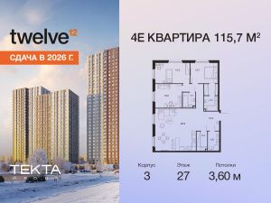 Рассрочка 0% с платежом от 120 000 ? в месяц. Сдача уже в 2026 году 4-комн. квартира в ЖК ''Twelve'' на 27 этаже в 28 этажном здании Корпус 3. Общая площадь: 115.7 кв.м., жилая: 75.20 кв.м. Высота потолков 3.60 м. ЖК Twelve от застройщика Tekta Group — это новый уровень жизни в районе Нагорный в 3-х минутах от станции метро. Проект представляет собой воплощение современной концепции комфортной жизни, где функциональность органично сочетается с эстетикой. Архитектура Twelve создает атмосферу, вдохновляющую на успех и располагающую к позитивным эмоциям. Дом, в котором каждый день будет наполнен уютом, а не рутинной работой и дорожными пробками. Twelve предлагает своим жильцам продуманные планировки, возможность объединения квартир, а также увидеть красоту города через угловое остекление увеличенных окон. Особое внимание уделено комфорту жителей: благоустроенная территория, зеленые насаждения, детские площадки, парковка. ЖК Twelve — это больше, чем просто жилье: это атмосфера умиротворенности, комфорта и гармонии.