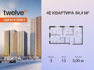 Рассрочка 0% с платежом от 120 000 ? в месяц. Сдача уже в 2026 году 4-комн. квартира в ЖК ''Twelve'' на 13 этаже в 28 этажном здании Корпус 3. Общая площадь: 84.4 кв.м., жилая: 58.00 кв.м. Высота потолков 3.00 м. ЖК Twelve от застройщика Tekta Group — это новый уровень жизни в районе Нагорный в 3-х минутах от станции метро. Проект представляет собой воплощение современной концепции комфортной жизни, где функциональность органично сочетается с эстетикой. Архитектура Twelve создает атмосферу, вдохновляющую на успех и располагающую к позитивным эмоциям. Дом, в котором каждый день будет наполнен уютом, а не рутинной работой и дорожными пробками. Twelve предлагает своим жильцам продуманные планировки, возможность объединения квартир, а также увидеть красоту города через угловое остекление увеличенных окон. Особое внимание уделено комфорту жителей: благоустроенная территория, зеленые насаждения, детские площадки, парковка. ЖК Twelve — это больше, чем просто жилье: это атмосфера умиротворенности, комфорта и гармонии.