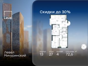 Цена указана с учётом скидки при 100%-й оплате, несубсидированной ипотеке, рассрочке (кроме программы ''Рассрочка 0%''). В жилом квартале, расположенном на границе с природным заказником ''Долина реки Очаковки'', продаётся 4-комнатная квартира площадью 72.60 кв.м без отделки. Квартира расположена на 27 этаже 31-этажного корпуса 13 в жилом комплексе бизнес-класса Левел Мичуринский (компания Level Group/Левел групп). Отличная транспортная доступность: - от 10 мин. пешком до станции метро ''Мичуринский проспект''- 15 мин. пешком до станции метро ''Аминьевская''- 7 мин. на авто до МКАД- 10 мин. на авто до ТТК- 15 мин. на авто до Москва-Сити Продуманный архитектурный проект:- Выразительная архитектура от известных бюро: корпуса 1-6 - СПИЧ, корпуса 7-13 - Borisov Architects,- Из окон открываются живописные виды на парки, Москва-Сити и МГУ,- Высокие потолки до 6,35 м,- Стильные лобби с окнами в пол и высокими потолками до 4,7 м,- С каждого этажа дома на лифте можно спуститься в подземный отапливаемый паркинг.Расположение:Левел Мичуринский строится в одном из самых зелёных районов Москвы - Очаково-Матвеевское. Этот уголок столицы идеален для поддержания здорового образа жизни. В шаговой доступности от проекта находятся заказник ''Долина реки Очаковки'' - 1 мин. пешком и Очаковский парк - 7 мин. пешком. На велосипеде можно добраться до таких парков, как ''Событие'', парк Олимпийской деревни, парк 50-летия Октября и парк Школьников.В 15 минутах езды на авто расположено более 30 детских садов (из них 14 в пешей доступности), 32 школы (из них 13 в пешей доступности) и 14 вузов. Также в ближайшем окружении - более 25 медицинских учреждений, 11 спортивных клубов и 22 продуктовых супермаркета.Внутренняя инфраструктура:На территории жилого комплекса строится три детских сада и школа. На первых этажах домов откроется супермаркет, фитнес-центр, ресторан, кафе и другие сервисы. Подземные этажи займут паркинги: трёхуровневые - в этапах 1 и 2, одноуровневый - в этапах 3 и 4.Преимущества проекта:- 4,5 га благоустроенной территории с видовым мостом, уличным кинотеатром, зонами для тихого отдыха, работы, воркаута, площадки для петанка, футбола, настольного тенниса и пляжного волейбола.- Дизайнерские лобби с панорамным видом на двор, мойками для лап животных и комфортными зонами ожидания.- Безопасность жителей: круглосуточное видеонаблюдение всех зон общего пользования (лобби, лифты, паркинги, детские площадки), система контроля доступа, управление видеодомофоном через мобильное приложение, единый ключ доступа на территорию жилого комплекса.- Технологии и комфорт: высокоскоростной Wi-Fi в лобби и на придомовой территории, автоматическая система контроля и учёта ресурсов, абонентская связь с консьержем, распознавание номеров автомобилей при въезде в паркинг и выезде из него.
