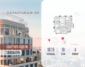 Скидка до 8% действует до 09.02.2026 г. при 100% оплате и не субсидированной ипотеке.Продается просторная квартира площадью 167.90 м2 в жилом комплексе ТАТАРСКАЯ, 35. Квартира находится в 1 секции корпуса 1. Этаж 10-й из 20.Квартира без чистовой отделки, с просторной кухней 41.90 м2. Жилая площадь 73.00 м2. Высота потолка от 3.50.ТАТАРСКАЯ, 35 - новая архитектурная доминанта Замоскворечья, достопримечательность на фотопанорамах исторического центра Москвы. Элитный дом, созданный для тех, кто умеет смотреть далеко вперед, мыслить масштабно и воплощать собственный сценарий жизни.Вдохновляющие прогулки по променаду набережной, в уютных переулках, в парке ''Зарядье'', в Михайловском саду и Репинском сквере. Наслаждение высоким искусством в Третьяковской галерее, Доме Музыки, театральном музее им. А.А. Бахрушина, театре на Малой Ордынке. За окнами - Кремль, высотка на Котельнической, панорамы Замоскворечья и острова Балчуг, огни Садового кольца.Собственные спорт-румы, детская, репетиторская, бьюти-пространства, деловое пространство с коворкингом, переговорной и сигарной. Собственный трехуровневый фитнесс-центр с бассейном, тренажерным залом, сауной, хаммамом, массажным кабинетом. Площадь двора - 1,8 га, половина территории покрыта деревьями, кустарниками и лужайками.Дом расположен внутри Садового кольца - отсюда в считанные минуты можно добраться до важнейших мест столицы: достопримечательностей и парков, театров и ресторанов, деловых и административных центров. 7 минут до Кремля на автомобиле, 15 минут до Третьяковской галереи и 8 минут до Садового кольца пешком.Планировочные решения и визуализации предварительны, возможны изменения.
