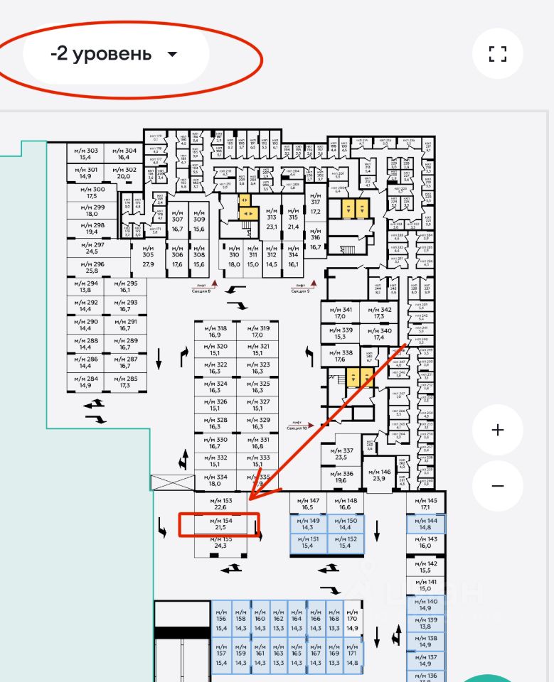 В продаже машино место на -2 этаже, номер 154, площадь 21.5 м2! Место расширенное и имеет два заезда! Срок сдачи дома январь 2026 года. Цена фиксируется до подписания акта приемки, далее удорожание на 10%!
