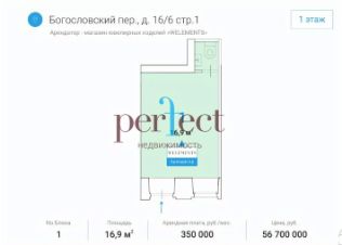 Продажа 16м2, ГАБ - Welements,бренд ювелирных украшений по адресу Богословский пер, 16/6с1Предлагается на продажу помещение в Богословском переулке, ЦАО, г. Москва, в районе знаменитых Патриарших. Продажа помещений у метро. Объект расположен в шаговой доступности от станций метро ''Тверская'', ''Пушкинская'' и ''Чеховская'' — 5 минут пешком. Интенсивный пешеходный трафик. Развитая инфраструктура, крупный жилой и деловой район.Арендная плата 350 000 рублей в месяц, коммунальные платежи и электричество оплачиваются арендатором отдельно. Схема сделки: договор купли-продажи недвижимости (ДКПН).Welements — бренд ювелирных украшений.Планировка — открытая (свободная), высота потолков — 3,0 м.Помещения с внутренней отделкой.Отдельная входная группа с фасада в каждый блок, есть вход со двора.Все городские инженерные коммуникации.ЭнергообеспечениеДостаточное количество под любой вид деятельности.Свободное использование — ограничений нет. Рассмотрим все предложения.Крупный деловой район с большим жилым массивом. В окружении расположены бизнес-центры ''Пушкинский'', ''Галерея Актер'', элитные жилые комплексы ''Сытинский'', ''Бакст на Патриарших'', ''Левенсон'', ''The Patricks'', Государственный центральный музей современной истории России, Литературный институт имени А. М. Горького, а также театры ''Практика'', ''Московский драматический театр имени А. С. Пушкина'', ''МХАТ им. Горького'', ''Электротеатр Станиславский''.