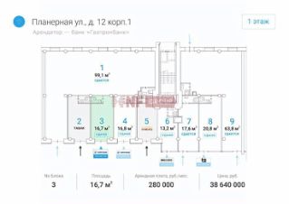 Лот: 33636. Напишите нам в чат или позвоните отправим подробную презентацию с фотографиями и всей информацией по объекту!Привлекательное местоположениеПредлагается к продаже торговая площадь в одном из самых оживленных районов Москвы — на улице Планерная, дом 12. Объект находится в Северо-Западном административном округе, всего в минуте пешком от станции метро ''Планерная''. Это обеспечивает отличную пешеходную и транспортную доступность, что делает помещение идеальным для бизнеса, ориентированного на высокий поток клиентов.Высокий рекламный потенциалПомещение обладает высоким рекламным потенциалом благодаря возможности размещения вывесок на фасаде здания. Это позволит вашему бизнесу быть заметным и привлекать внимание прохожих, что особенно важно для розничной торговли и сферы услуг.Развитая инфраструктураОбъект расположен в крупном жилом районе с высокой плотностью застройки и развитой инфраструктурой. В непосредственной близости находятся транспортно-пересадочный узел и торговый центр ''Планерная'', что обеспечивает постоянный поток потенциальных клиентов.Универсальность использованияСвободная планировка и высота потолков 3,7 метра позволяют адаптировать помещение под любой вид деятельности. Это может быть торговое помещение, магазин, ресторан, кафе, аптека, салон красоты, банк, офис продаж или кофейня. Возможности ограничены только вашей фантазией и бизнес-идеей.Надежный арендаторНа данный момент помещение арендуется Газпромбанком, что свидетельствует о его надежности и стабильности. Это также может быть интересным вариантом для инвесторов, ищущих готовый бизнес с арендатором.Это предложение — редкая возможность приобрести коммерческую недвижимость в одном из самых перспективных районов Москвы. Не упустите шанс инвестировать в объект с высоким потенциалом доходности и стабильным арендатором.Заходите в профиль, чтобы увидеть еще больше интересных предложений.