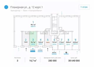 Лот: 38433. Помещение свободного назначения формата Street Retail в СЗАО Москвы. Шаговая доступность от ст. метро ''Планерная'' — 1 минута пешком. Отличная пешеходная и транспортная доступность. Помещение расположено в крупном сложившемся жилом районе с высокой плотностью застройки и развитой инфраструктурой.Арендатор: Газпромбанк.МАП: 280 000 руб.