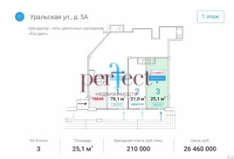 Продажа готового арендного бизнеса — торговое помещение с сетевым арендатором ''РОСЦВЕТ'' площадью 25.1 м2 по адресу: ул. Уральская, 5 Арендатор - Сеть цветочных магазинов ''Росцвет'' В магазине представлена цветочная продукция высочайшего качества со всего мира, уникальный ассортимент и приемлемые цены. ПРЕДЛАГАЕТСЯ ПРОДАЖА ПОМЕЩЕНИЯ Торговое назначение Отдельная входная группа с фасада Планировка — открытая (свободная) Все городские инженерные коммуникации Высокий рекламный потенциал и места для размещения вывесок Отличная пешеходная и транспортная доступность. Сложившееся торговое окружения В помещениях возможны вытяжные воздуховоды до уровня кровли УСЛОВИЯ АРЕНДЫ И ПРОДАЖИ Арендная плата 210 000 рублей в месяц, коммунальные платежи и электричество оплачиваются арендатором отдельно. Схема сделки: договор купли-продажи недвижимости (ДКПН).