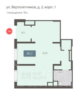 Коммерческое помещение площадью 80.2 м², расположено по адресу: г. Москва, улица Вертолётчиков, 2к1, помещение 16Н, район Некрасовка. Объект занимает 1 этаж в здании с этажностью 26 этажей. Помещение без отделки, свободного назначения, имеет отдельный вход. Здание относится к типу жилого, построено в 2019 году. Предусмотрено электричество, канализация, водоснабжение, отопление.