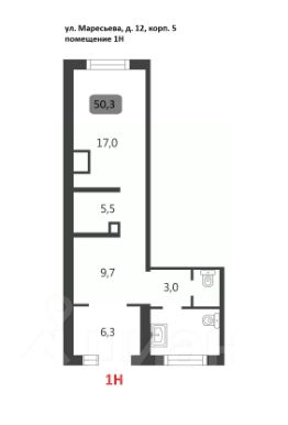 Коммерческое помещение площадью 50.3 м², расположено по адресу: г. Москва, улица Маресьева, 12к5, помещение 1Н, район Некрасовка. Объект занимает 1 этаж в здании с этажностью 14 этажей. Помещение без отделки, свободного назначения, имеет отдельный вход. Здание относится к типу жилого, построено в 2019 году. Предусмотрено электричество, канализация, водоснабжение, отопление.